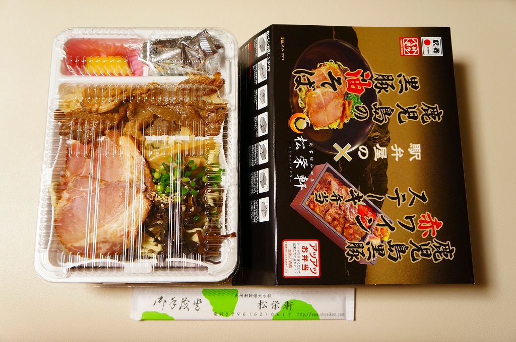 京王百貨店の駅弁大会での八戸・高松・出水の「駅麺対決」のために、2013(平成25)年1月17日の会期後半に初登場。長方形の加熱機能付き容器に、既存の鹿児島黒豚赤ワインステーキ弁当と、新開発のラーメンを詰めて、タレとサツマイモを添える。