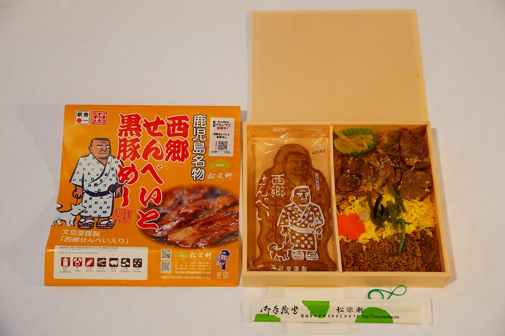 2023(令和5)年10月に出水駅と鹿児島中央駅で発売、同月からのJR九州の駅弁キャンペーン「第14回九州駅弁グランプリ」にエントリー。犬を連れた西郷隆盛のイラストと中身のイメージ写真を使う黄色い掛紙に包まれた、平たい長方形の容器のふたを開けると、半分弱の区画に西郷隆盛の全身像の煎餅が置かれ、残りの区画に黒豚たれ焼きと豚そぼろと錦糸卵などで覆われる茶飯を配置。これは煎餅が本体で豚飯がおまけなのか、その逆なのか、弁当としての容器の使い方がおかしくて、記憶に残る。駅弁大会シーズンの半年間ほどの販売か。