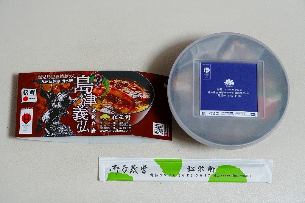 今回は黒いプラ容器が円錐状とボウル状で2種類あり、この島津義弘はボウル状のもの。これに島津家の家紋を入れ、日本古窯弁当と同じ半透明のふたをして、今回のシリーズで共通のしおりを置き、それらしき絵柄のスリーブで留める。中身は鶏飯を錦糸卵と黒豚のそぼろと焼豚で覆い、紅生姜を添えるもの。鹿児島名物の鹿児島黒豚をじっくりたれに漬込み焼き上げた焼豚とそぼろのお弁当とする。東京へ輸送される鹿児島の黒豚駅弁に共通する、濃いタレ味と固い食感とかすかな塩素臭があった。3月までスーパーなどの駅弁催事で販売か。