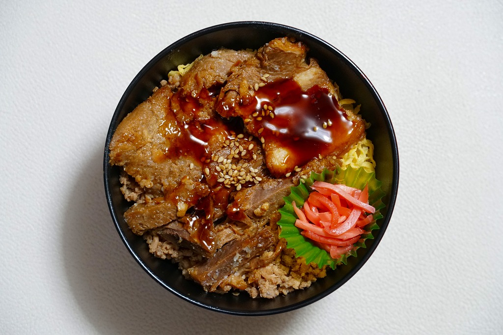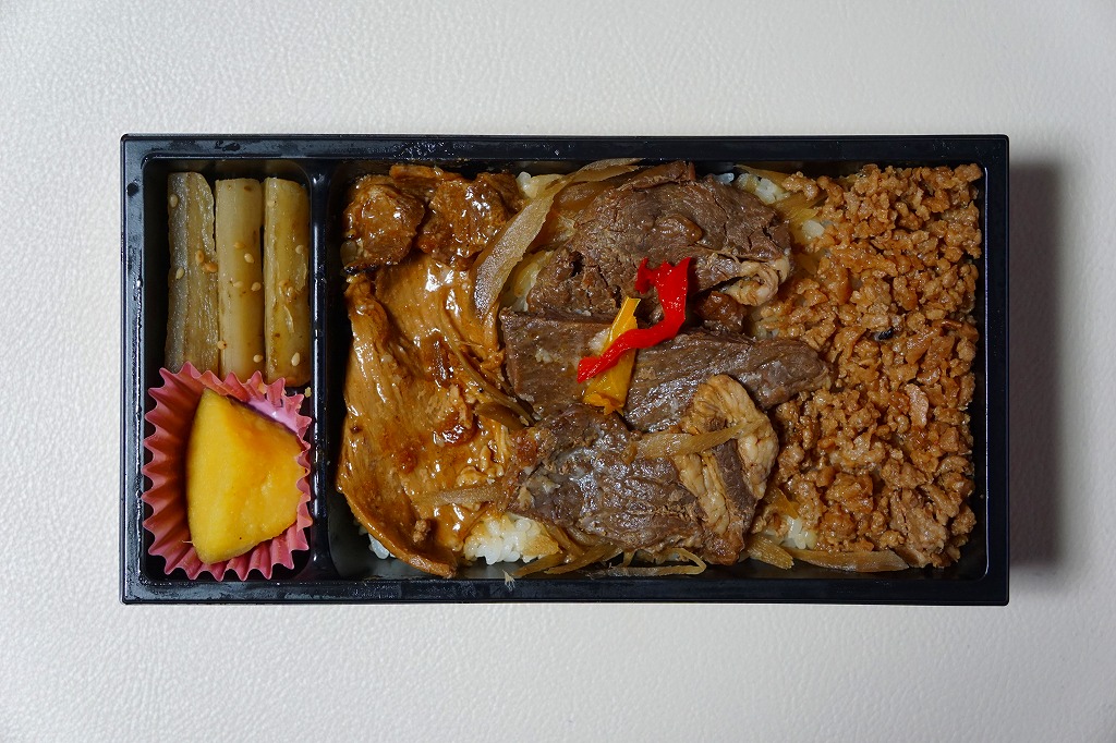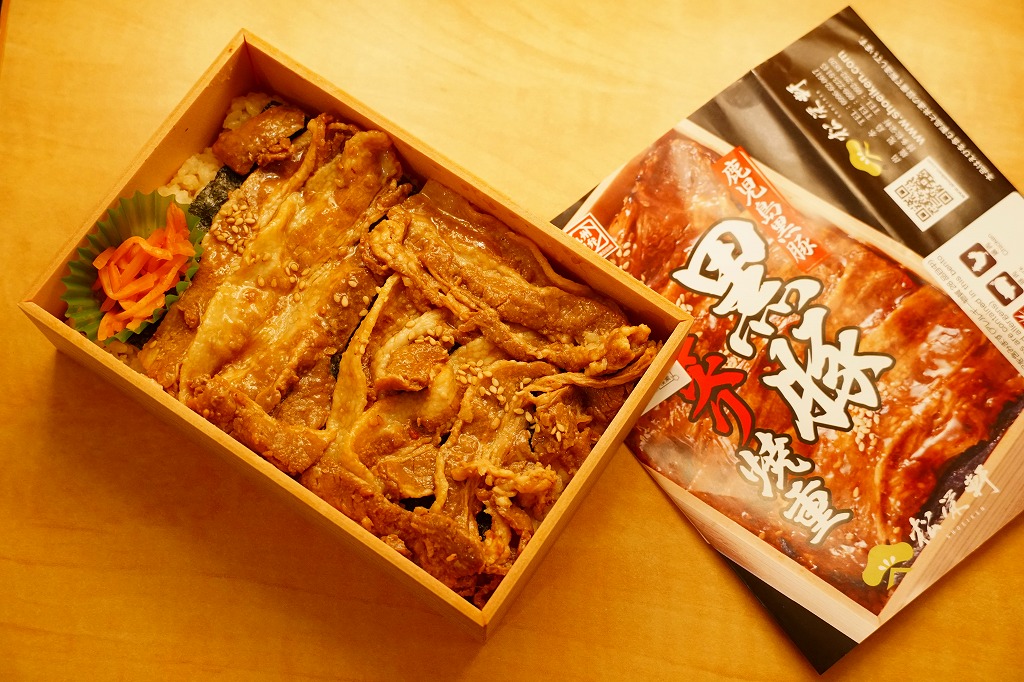 秋冬の駅弁大会シーズンに向けた、2022(令和4)年秋の新商品か。10月のJR九州の駅弁キャンペーン「第13回九州駅弁グランプリ」にエントリー。長方形の容器になぜか「とりめし」を詰め、海苔で覆い、黒豚炙り焼と表現する豚焼肉で覆い、紅生姜を添える。これとまったく同じ駅弁は過去に無いようだが、同じく思える内容には、上記や下記のとおり今まで度々出会ってきており、写真をよく見比べなければ違いが分からない。強いタレの味で茶飯を食べる、肉が豚でも牛でも鶏でも、違いが出ないかもしれない内容に感じた。価格は2022年の発売時で1,250円、2025年時点で1,320円。