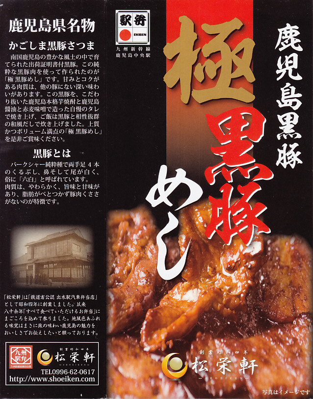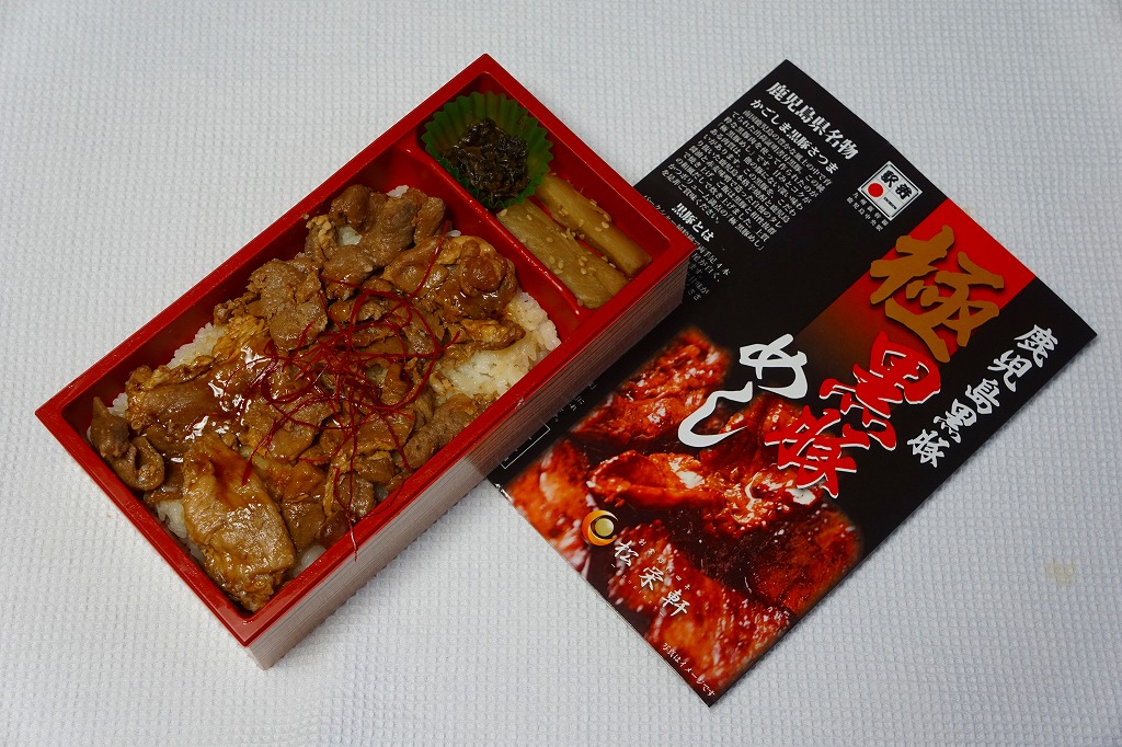 JR九州の観光キャンペーン「鹿児島スイッチ」とのタイアップ商品として、2007(平成19)年10月に発売。ただし、購入したものの中身は、2種の御飯に多種のおかずを詰めた当時の内容とはまるで異なる。白御飯の上にささがきごぼうを敷き、掛紙に書かれるとおり黒豚のステーキ、そぼろ、焼肉で覆い、さつまいもレモン煮とごぼうを添える。