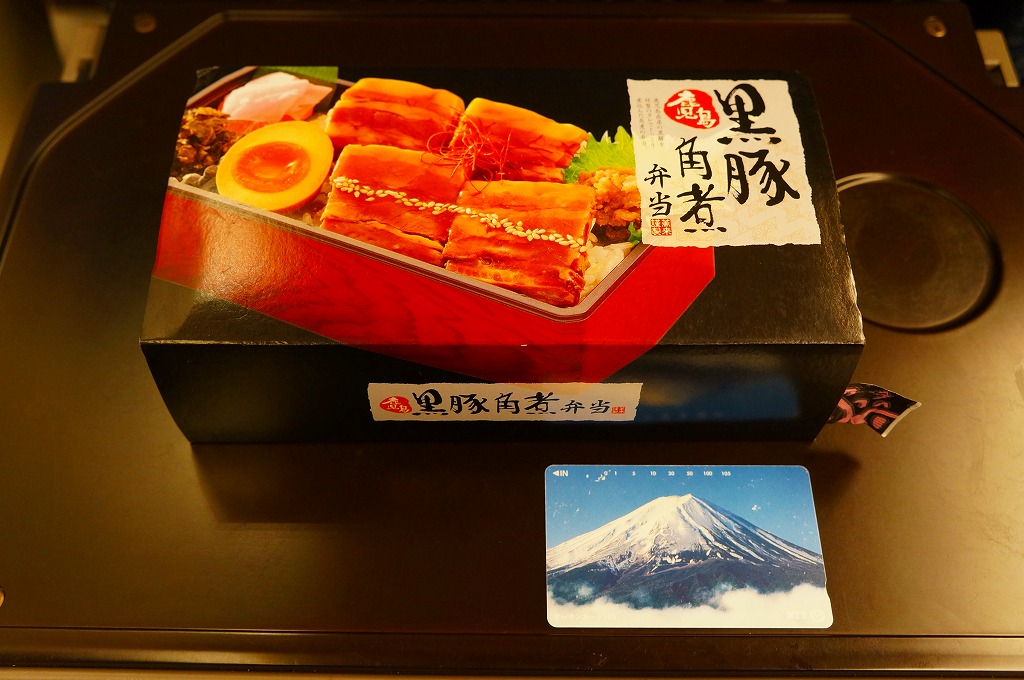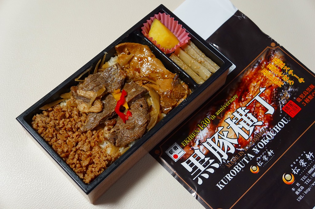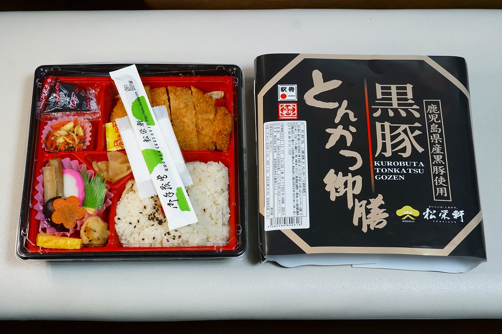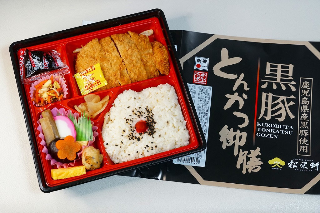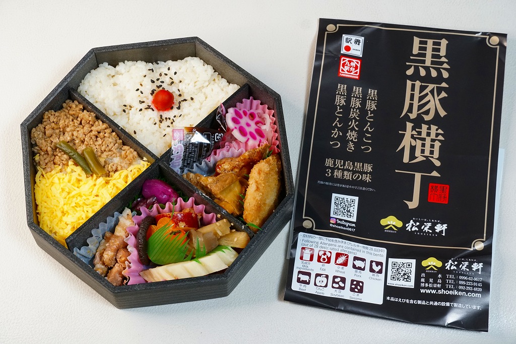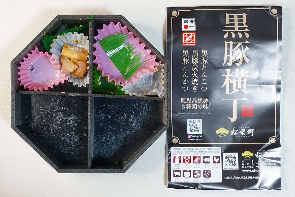 真っ黒な正八角形の容器を4区画に仕切り、日の丸御飯、茶飯を豚そぼろと錦糸卵で覆うもの、黒豚のとんこつと炭火焼とトンカツ、煮物や酢の物やサツマイモなどを詰める。豚の料理や駅弁は各地に出ても、とんこつは鹿児島特有なので、もっとご当地駅弁に入れてほしいもの。値段は2016年時点で1,080円、2019年10月から1,150円、2023年時点で1,200円。2024年までの販売か。