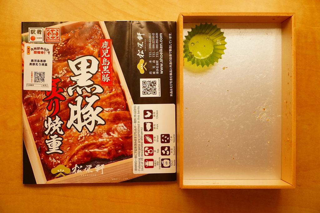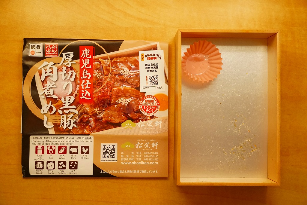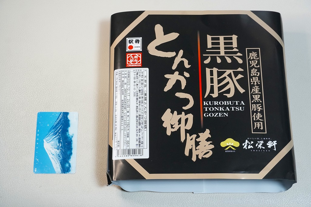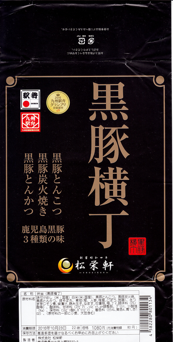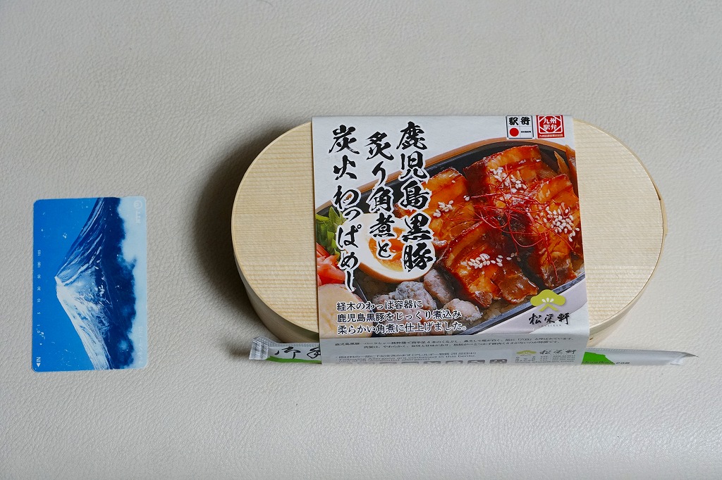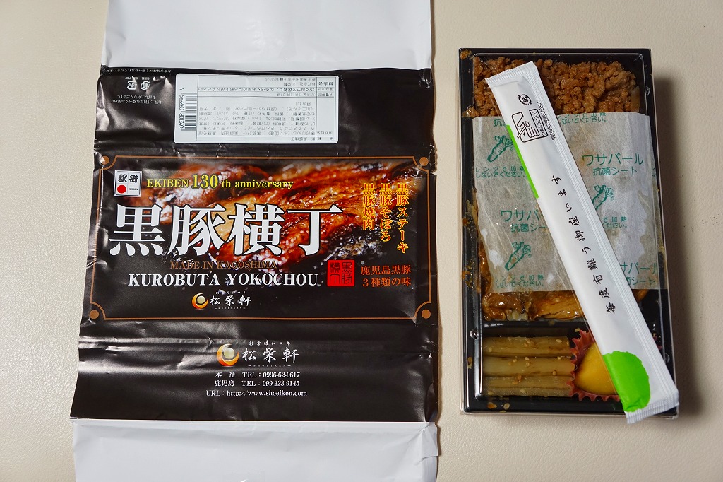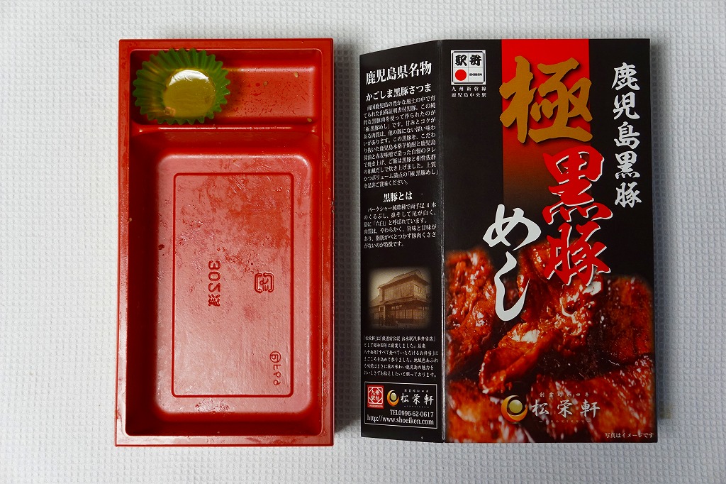 真っ黒な正八角形の容器を4区画に仕切り、日の丸御飯、茶飯を豚そぼろと錦糸卵で覆うもの、黒豚のとんこつと炭火焼とトンカツ、煮物や酢の物やサツマイモなどを詰める。豚の料理や駅弁は各地に出ても、とんこつは鹿児島特有なので、もっとご当地駅弁に入れてほしいもの。値段は2016年時点で1,080円、2019年10月から1,150円、2023年時点で1,200円。2024年までの販売か。
