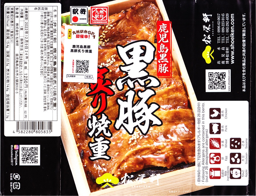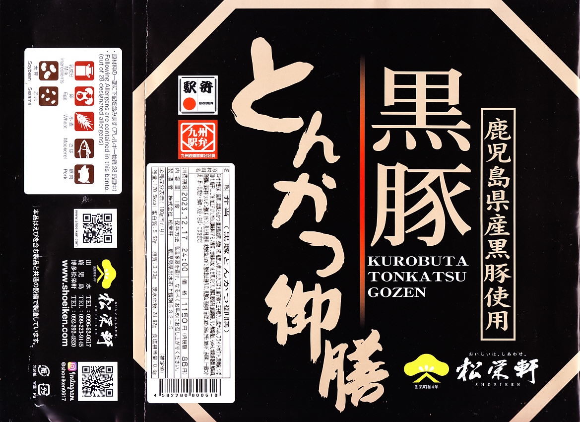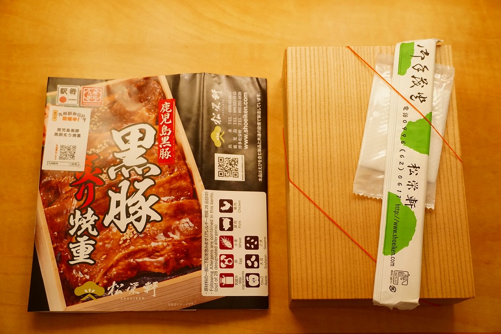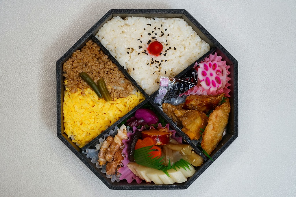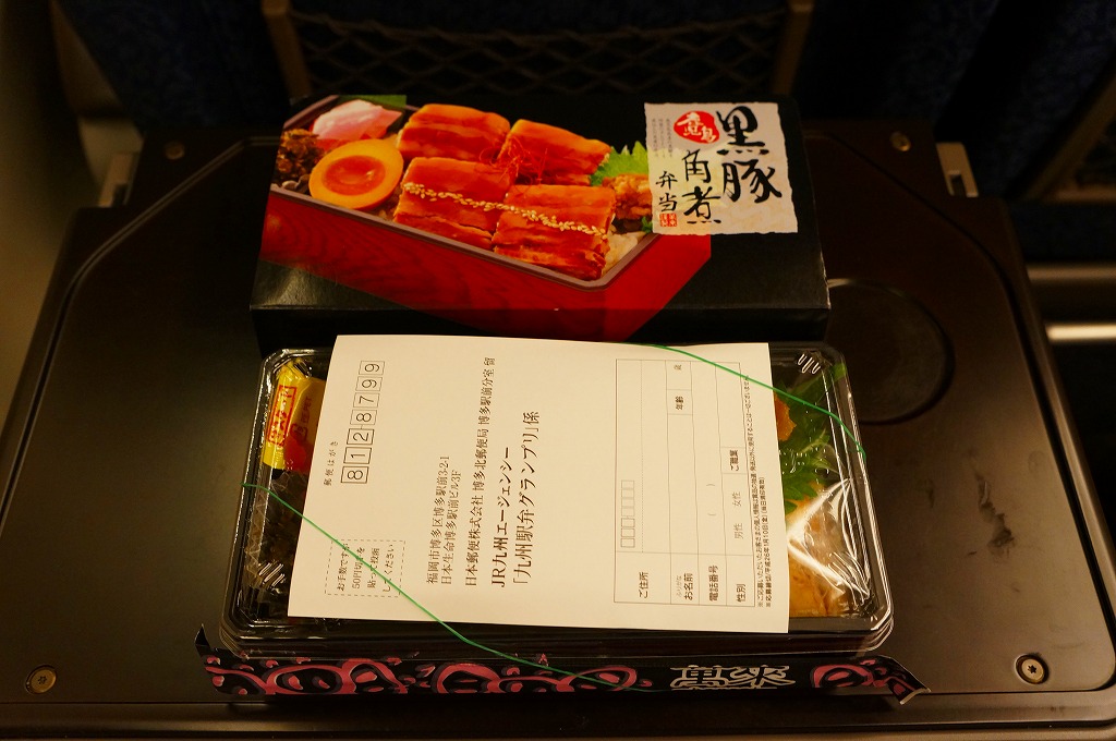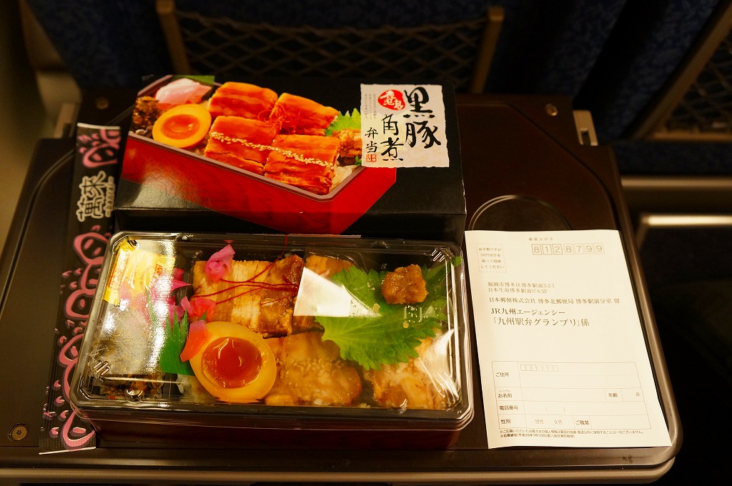 真っ黒な正八角形の容器を4区画に仕切り、日の丸御飯、茶飯を豚そぼろと錦糸卵で覆うもの、黒豚のとんこつと炭火焼とトンカツ、煮物や酢の物やサツマイモなどを詰める。豚の料理や駅弁は各地に出ても、とんこつは鹿児島特有なので、もっとご当地駅弁に入れてほしいもの。値段は2016年時点で1,080円、2019年10月から1,150円、2023年時点で1,200円。2024年までの販売か。