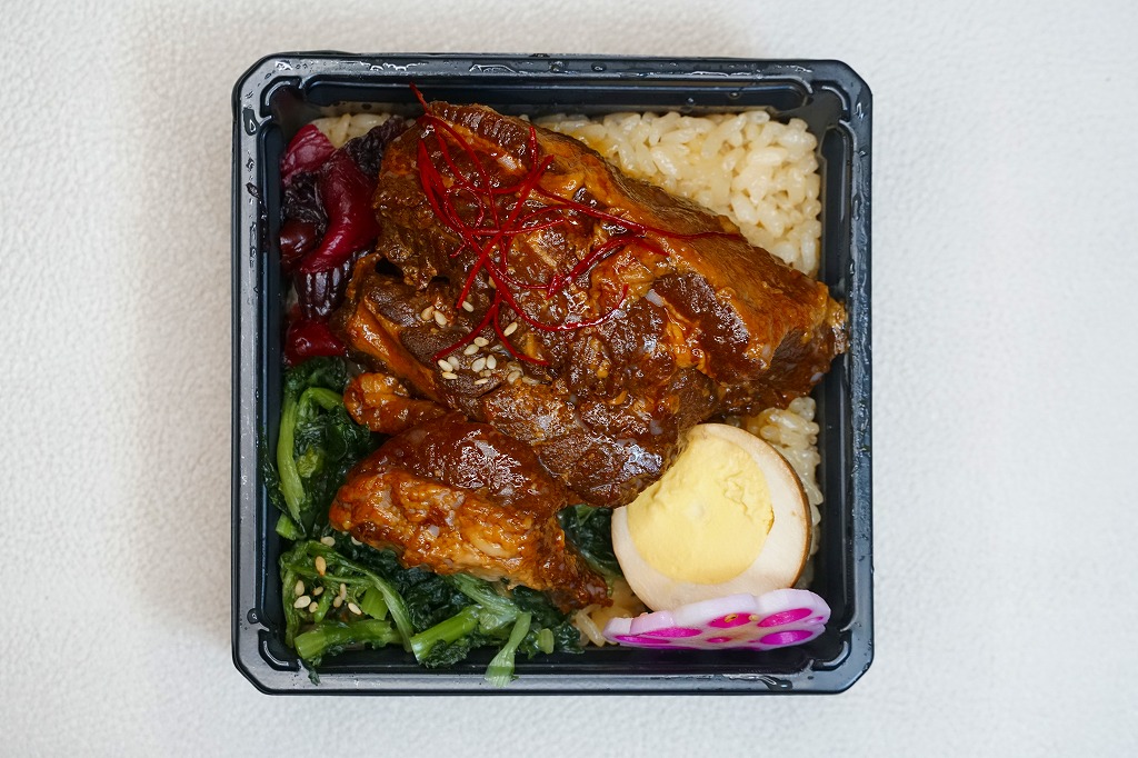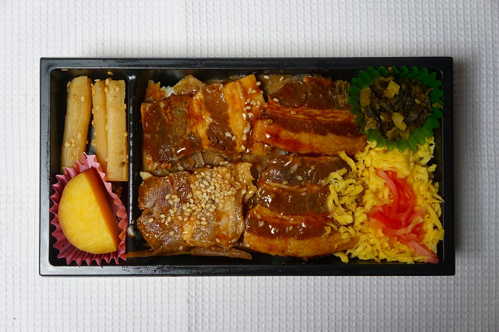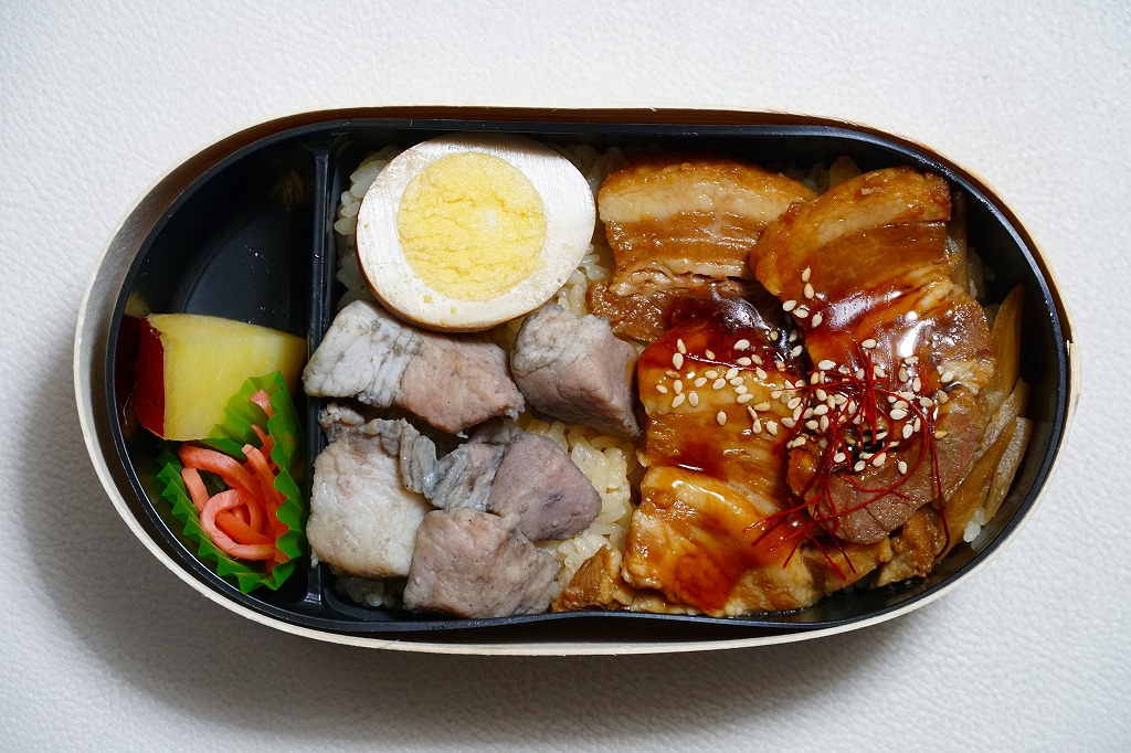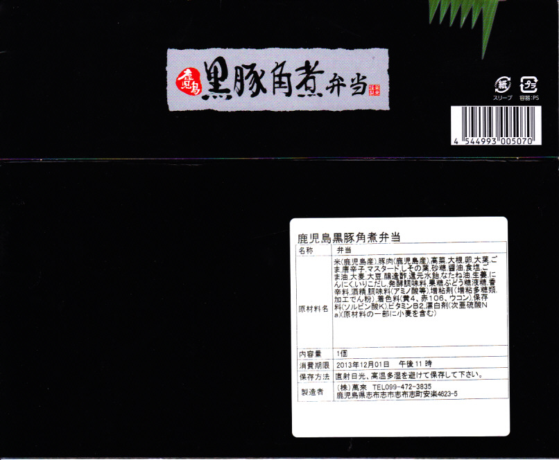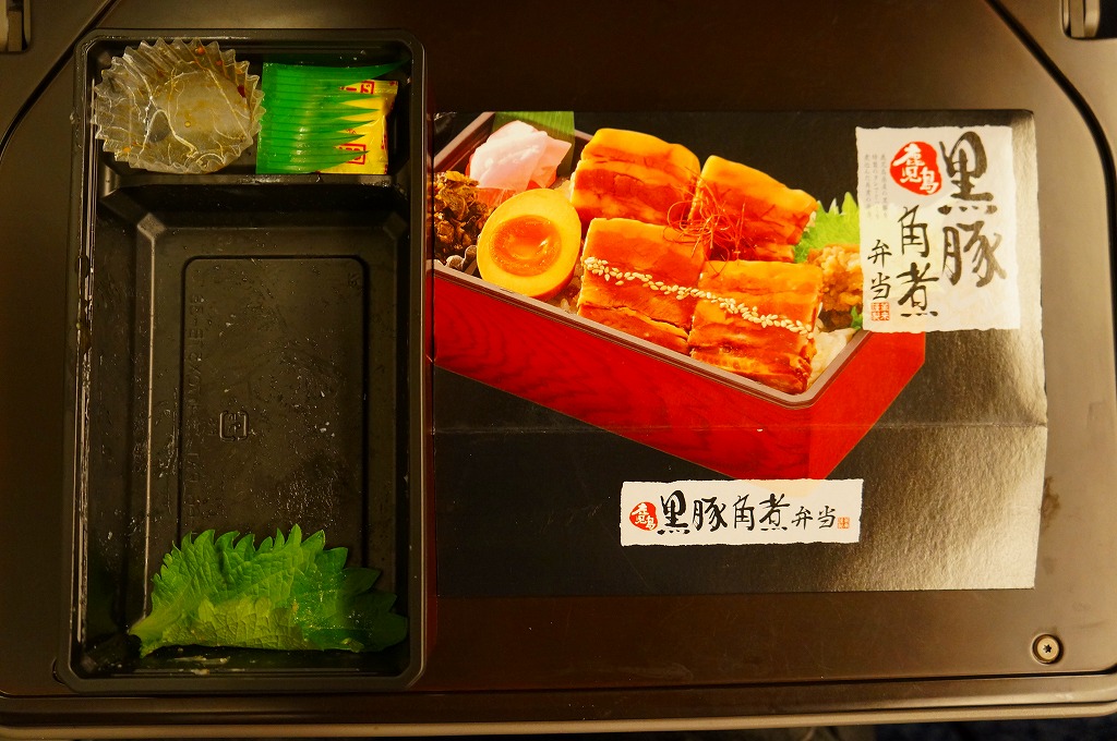 百貨店催事に空弁に道弁にネット通販にと活躍する豚角煮弁当が、2011(平成23)年までに鹿児島中央駅にも進出。白御飯の上を、形がきれいでおいしそうで分厚い豚角煮で覆い、半熟卵と豚味噌を添え、高菜炒めと大根桜漬とマスタードを付ける。豚角煮と煮玉子はコテコテでトロトロで、豚味噌はお湯で溶けばとんこつラーメンの汁になりそうな、御飯を濃厚にいただく駅弁。これは駅弁大会に向きそう。価格は2013年の購入時で1,050円、2014年4月の消費税率改定で1,080円。2020年はこれが志布志駅の駅弁として、大手スーパーの駅弁大会で売られたらしい。