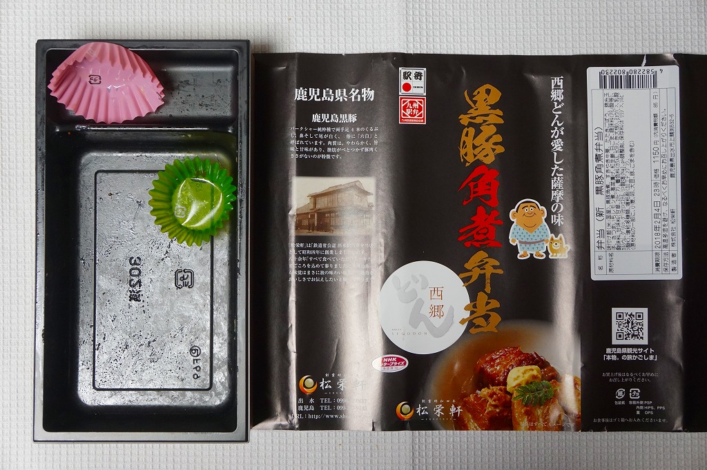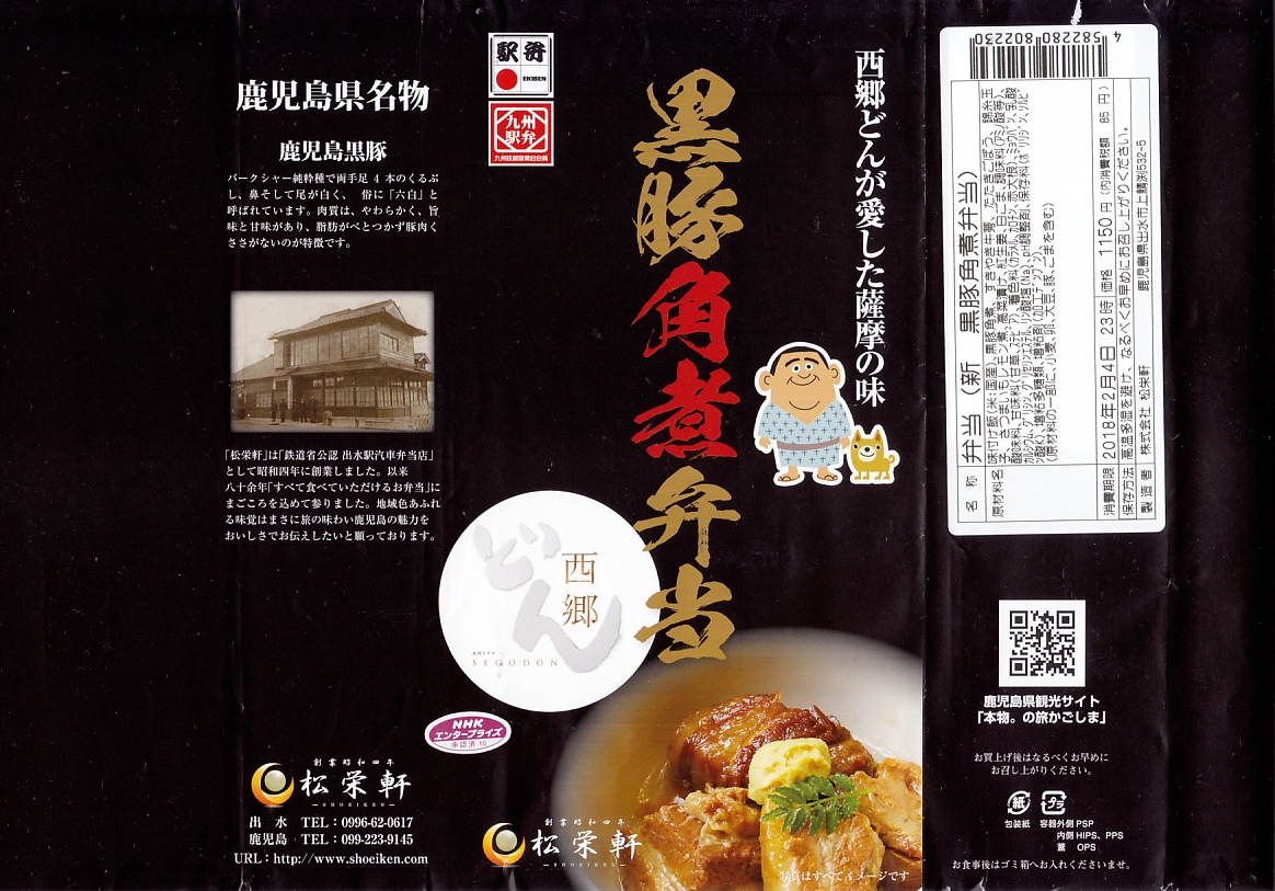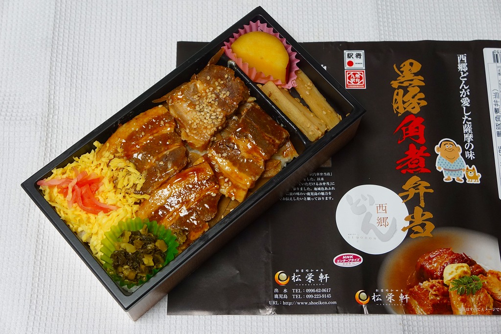 2017(平成29)年1月か、それ以前の発売か。真っ黒でシンプルなデザインの掛紙には、2018(平成30)年のNHK大河ドラマ「西郷どん」に関する絵柄や承認済シールがあった。中身は白御飯を黒豚角煮4枚と錦糸卵と高菜で覆い、ゴボウとサツマイモと紅生姜を添えるもの。見た目どおりの強い味。東京駅でも輸送販売される。2018年までの販売か。