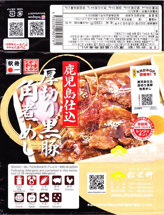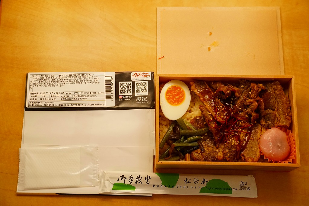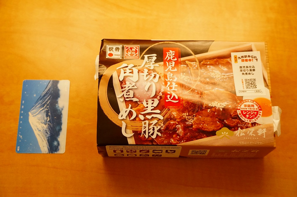 2024(令和6)年1月の京王百貨店の駅弁大会で実演販売。2月の阪神百貨店の駅弁大会でも実演販売。見栄え重視の惣菜容器に茶飯を詰め、「鹿児島黒豚げんこつ黒豚角煮」とする肉塊をどんと置き、煮玉子、花れんこん、菜の花、柴漬けを添える。催事場での注目と集客は控えめに見えたが、豪快なのに柔らかく食べやすい豚角煮は、鹿児島中央駅にあふれる黒豚駅弁のどれよりも、視覚と味覚に訴えてくると思う。人気投票にかければ高得点を期待できそう。3月まではスーパーの駅弁催事などで販売か。