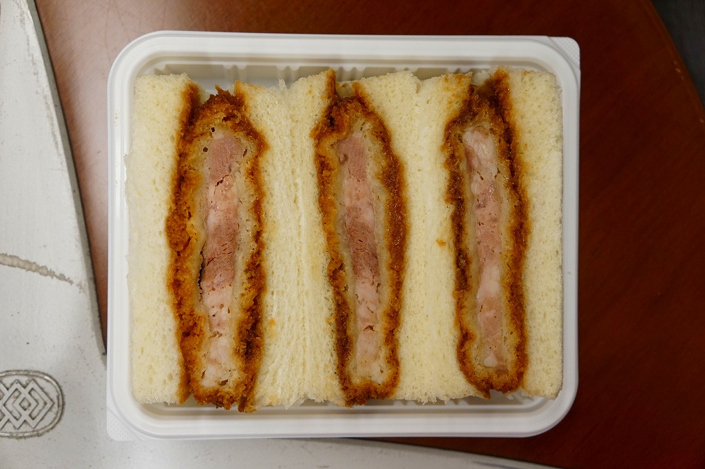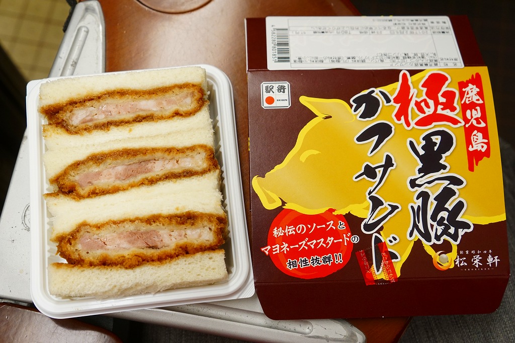 2017(平成29)年の発売か。ソース漬けにしたロースカツを塗ったパンに挟んで3切れ、マスタードやマヨネーズを別添し、白いプラ製トレーに詰め、商品名を描いた紙箱に収める。駅弁に限らずごく普通の、今風なカツサンド。2019年時点で博多松栄軒の博多駅弁になっている模様。価格は2017年の発売時で780円、2023年時点で830円、2024年時点で850円、2025年時点で880円。