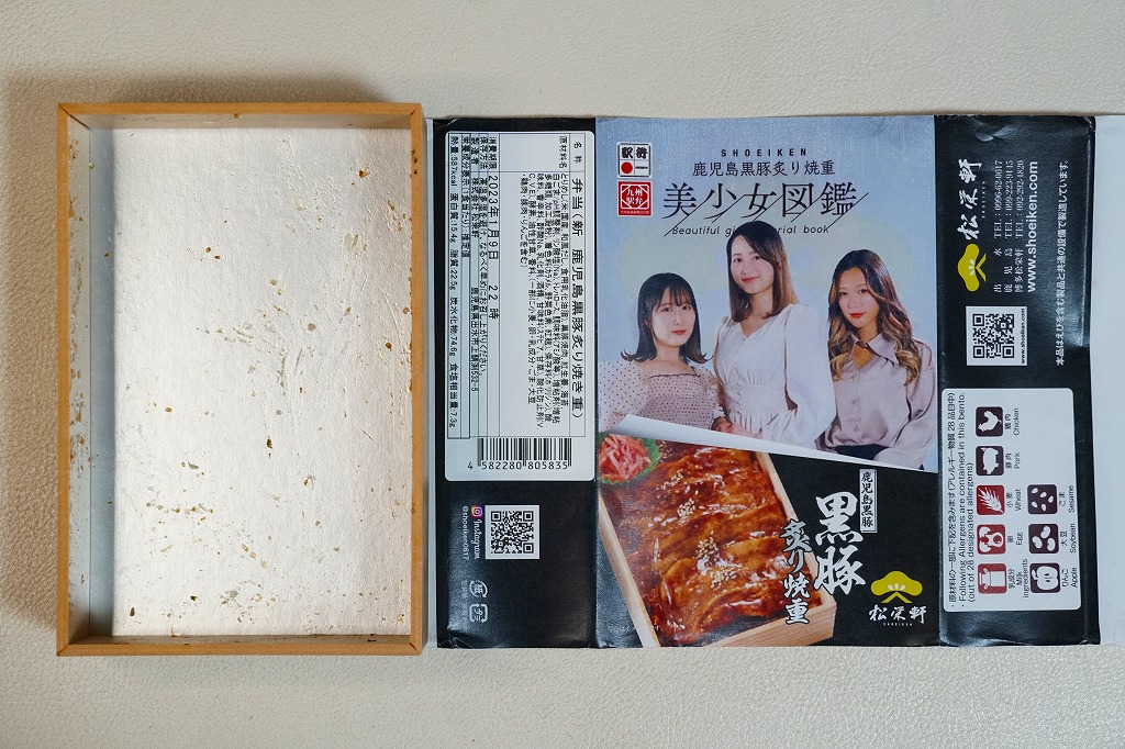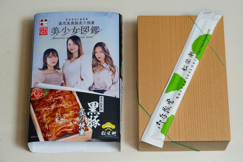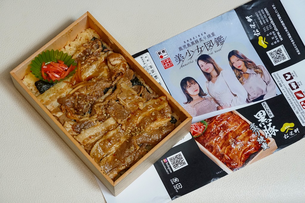 上半で「鹿児島黒豚炙り焼き重」、下半で「鹿児島黒豚黒豚炙り焼き重」、食品表示で「新鹿児島黒豚炙り焼き重」と、商品名が微妙に異なる掛紙には、中身の一部と女性3名の写真が使われる。中身は「とりめし」と表記された茶飯を、海苔と黒豚焼肉で覆い、紅生姜を添えた、豚焼肉丼。つまり2022年の秋の新商品「鹿児島黒豚黒豚炙り焼重」の、掛紙を替えたもの。東京や大阪や福岡や鹿児島の駅でおなじみの、安全な味といえる。