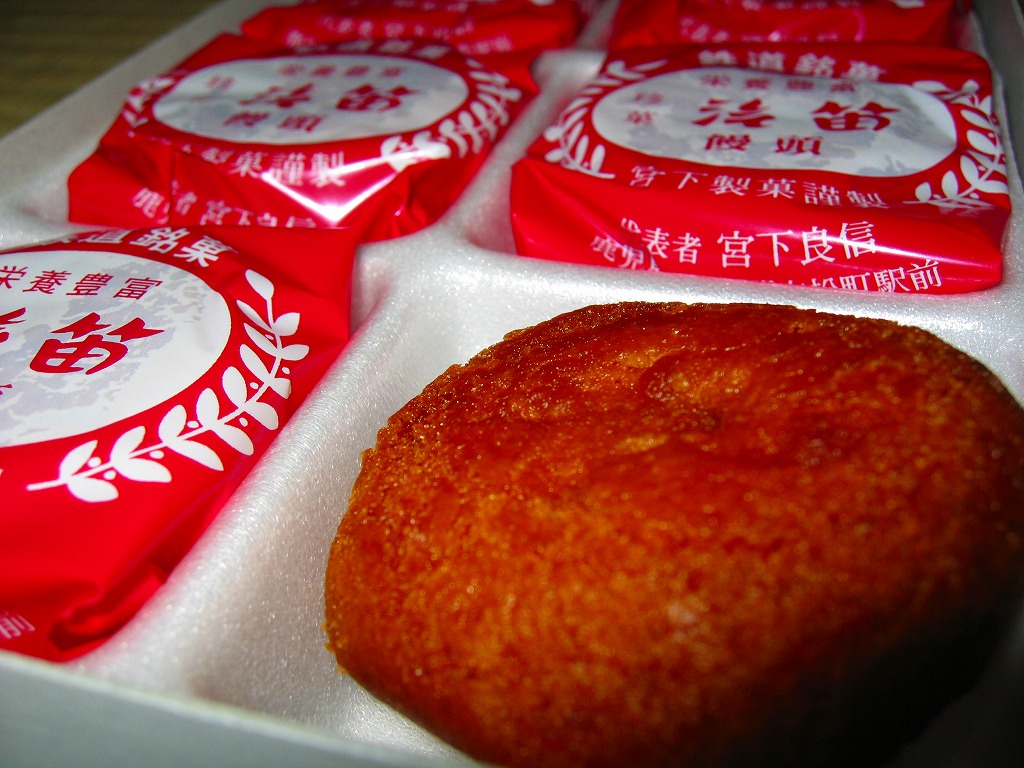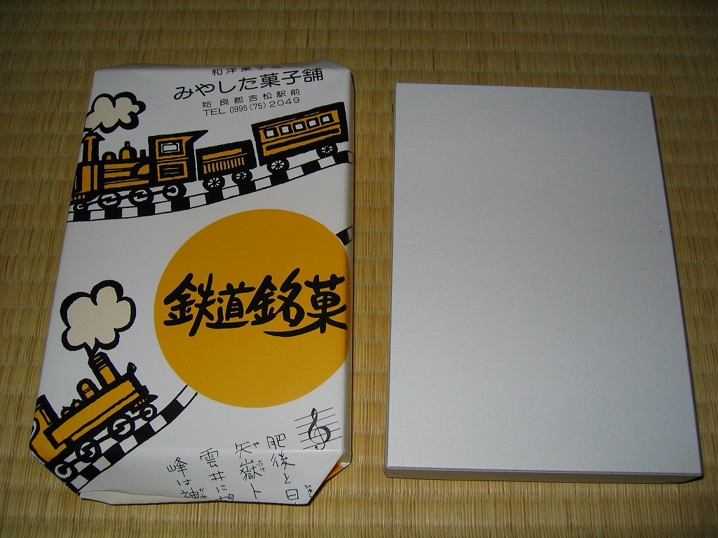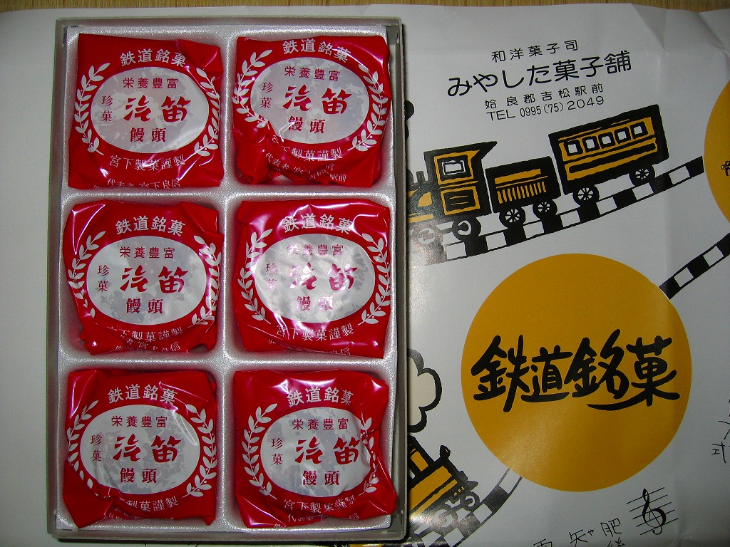 鉄道の町である吉松の銘菓。発泡スチロールのトレーを入れた白いボール紙の箱を、SL絵柄の包装紙で包む。赤いビニールで個別包装された中身は、かつてパン屋さん等で売られていた甘食の中に白あんを詰めたような、甘い甘い揚げ饅頭。