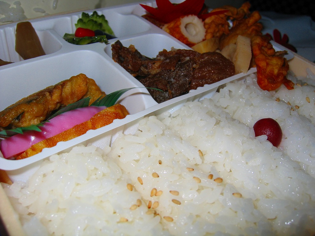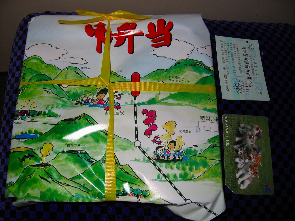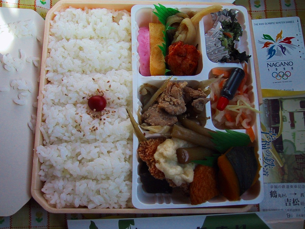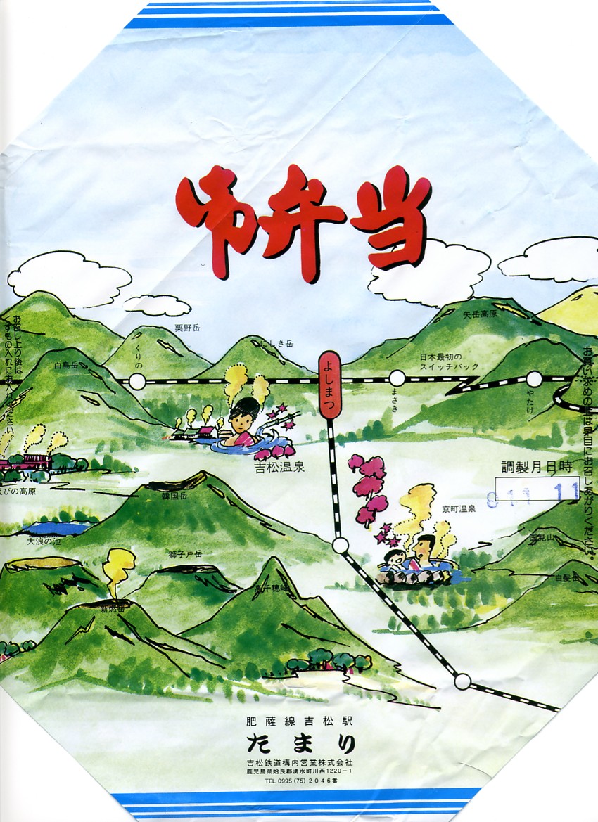 底面に経木を使った正方形の容器を、駅周辺の俯瞰イラストを描く掛紙で包み、ビニールひもでしばる。中身は前回収穫の「おべんとう」と同じく、ホカホカ御飯と冷蔵おかずの組み合わせで、細長日の丸俵飯にかき揚げ、揚げナス、かまぼこ、玉子焼、ゴーヤーなど。他の収穫報告を見ると、おかずの種類は一定していない模様。駅弁文化を楽しむためのお弁当。「九州鉄道構内会」公式サイトによると、吉松駅の幕の内弁当は3種類が存在するというが、この1種類しか見たことがない。駅弁屋の閉店により、2018(平成30)年9月限りで終売。