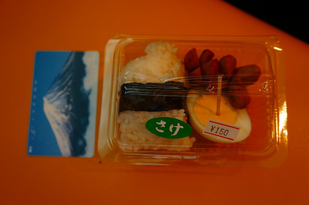 これは駅弁ではなく、伊江島と沖縄本島の本部を結ぶ村営フェリーの売店で販売されていた惣菜のひとつで、とても細い海苔を締めた鮭の三角おむすびに、ゆで卵を半分と、タコ状ウインナー揚げ2個を添えたもの。