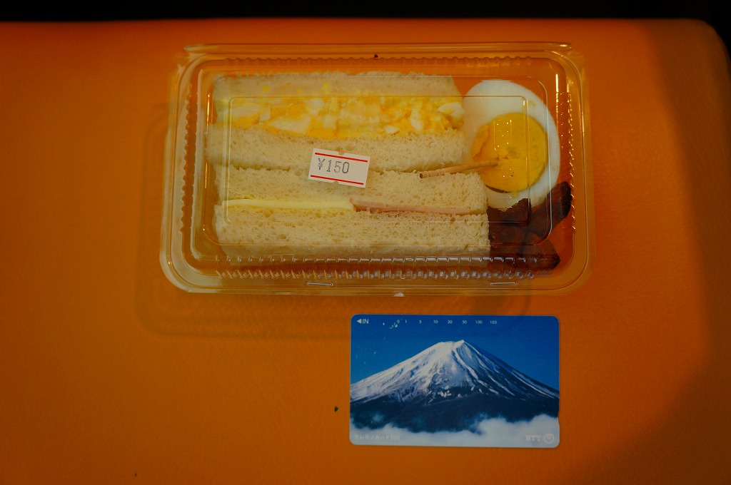 これは駅弁ではなく、伊江島と沖縄本島の本部を結ぶ村営フェリーの売店で販売されていた惣菜のひとつで、とても小さな透明のプラ製の惣菜容器にタマゴサンド、ハムチーズサンド、半分のゆで卵、タコ状ウインナー揚げを詰めていた。