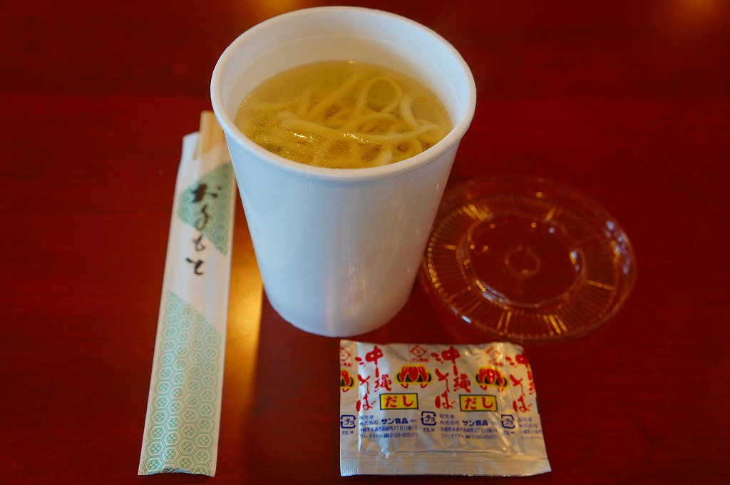 これは駅弁ではなく、伊江島と沖縄本島の本部を結ぶ村営フェリーの売店で販売されていた持ち帰り商品。注文すると麺入りカップにスープを注ぎ、袋入りのだしを添えてくれる。具はまったくないけれど、味はだいたいあの沖縄そば。列車内からも船着き場からも船内からも売店がどんどんなくなる昨今、片道わずか30分の生活路線でこんなものに出会えるとは思わなかった。
