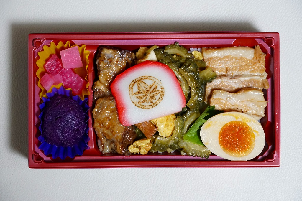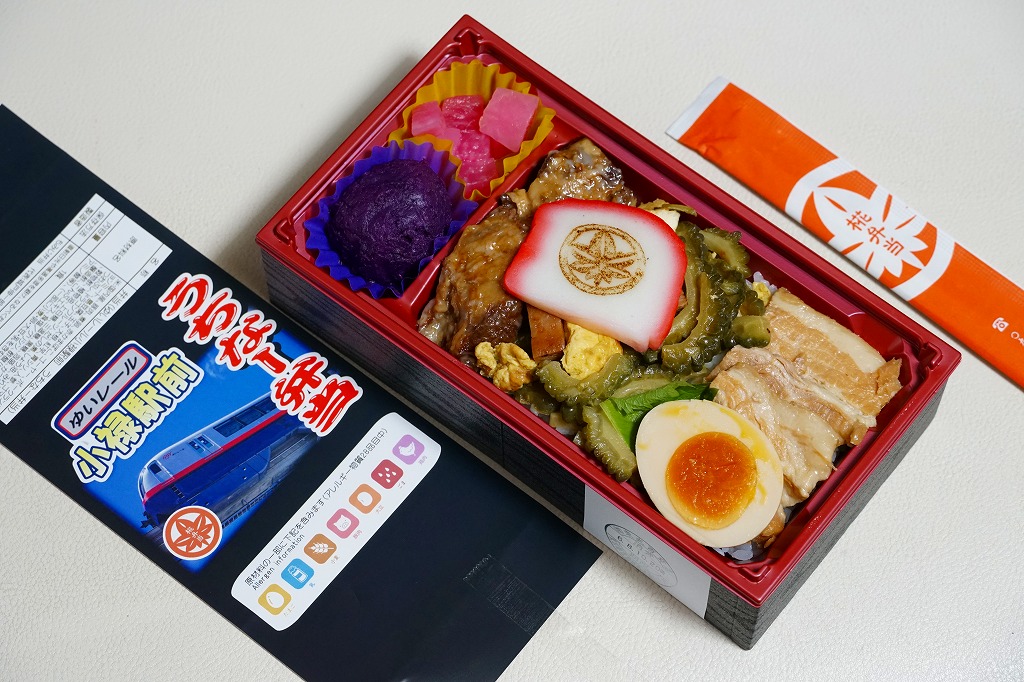 商品名が書かれた掛紙には、ゆいレールの電車の写真が使われる。長方形のプラ容器に白飯を詰め、らふてぃ、軟骨ソーキ、ゴーヤーちゃんぷるーで覆い、赤かまぼこと煮玉子を載せ、ドラゴンフルーツと大根の甘酢漬けと紅芋のマッシュを添える。現物で特に解説をしなくても、旅行者でも那覇や沖縄本島に何度か来ていれば、きっと実に沖縄らしい弁当だと感じさせてくれる内容を、1食分でコンパクトに詰めていた。冷めてもおいしく駅弁らしい弁当、見た目も良い弁当にしたためか、沖縄のお店では見られないような高額な弁当になったと思う。