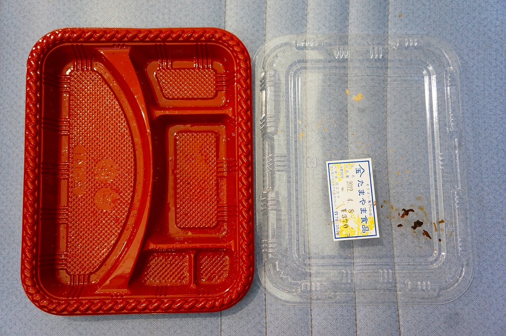 これは駅弁ではなく、宮古島へのフェリーが発着する伊良部島の佐良浜(さらはま)港の売店で売られていた惣菜。プラ製トレーの惣菜容器に白御飯、白身魚フライ、豚バラとニンジンとダイコンの煮物、キャベツとニンジンの野菜炒め、塩やきそばが入る。普段着の沖縄らしい、茶色と油のお弁当。伊良部島ではこれが、コンビニ弁当やスーパーの惣菜を兼ねているのだろう。