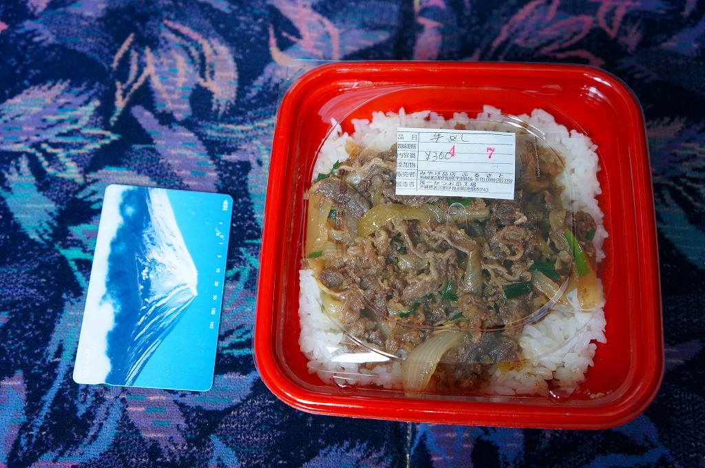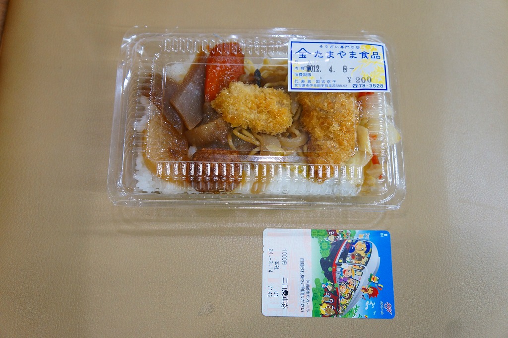 これは駅弁ではなく、宮古島へのフェリーが発着する伊良部島の佐良浜(さらはま)港の売店で売られていた惣菜。小柄な牛丼。白御飯の上に固く油っぽい牛肉煮が置かれる。この他に三角形や四角形のおにぎり、ハンバーガー、御飯に炒め物を載せた弁当など、油っぽく健康に悪そうだと見える惣菜が10種類以上販売されていた。船弁や港弁というほど飾りのあるものではない、日用品かつ実用品。
