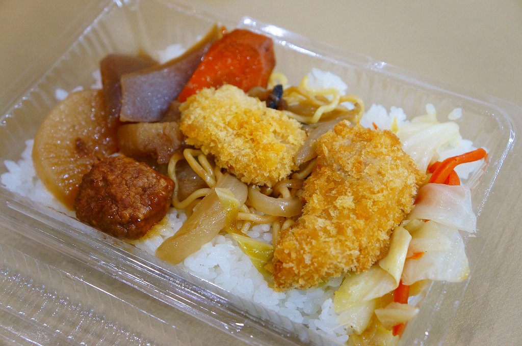 これは駅弁ではなく、宮古島へのフェリーが発着する伊良部島の佐良浜(さらはま)港の売店で売られていた惣菜。透明で簡易なプラ製の惣菜容器に白御飯を敷き、焼きそば、フライ、肉団子、こんにゃくとダイコンとニンジンの煮物、キャベツとニンジンの炒め物、塩焼きそばを載せるもの。こういう格安で珍妙な市販メニューもまた、沖縄の名物であるような気がしてきた。