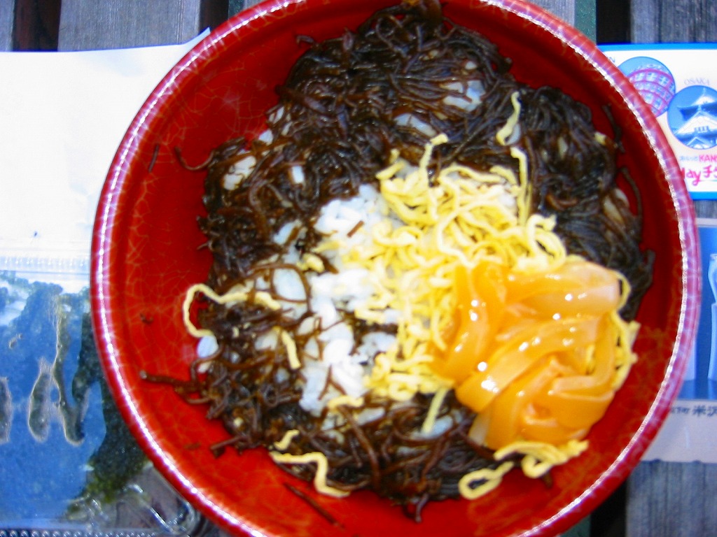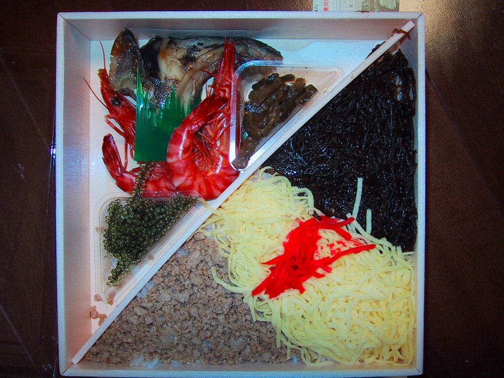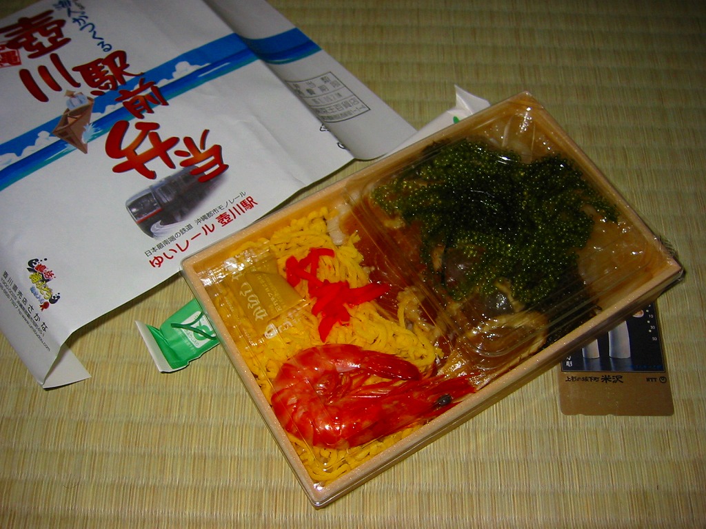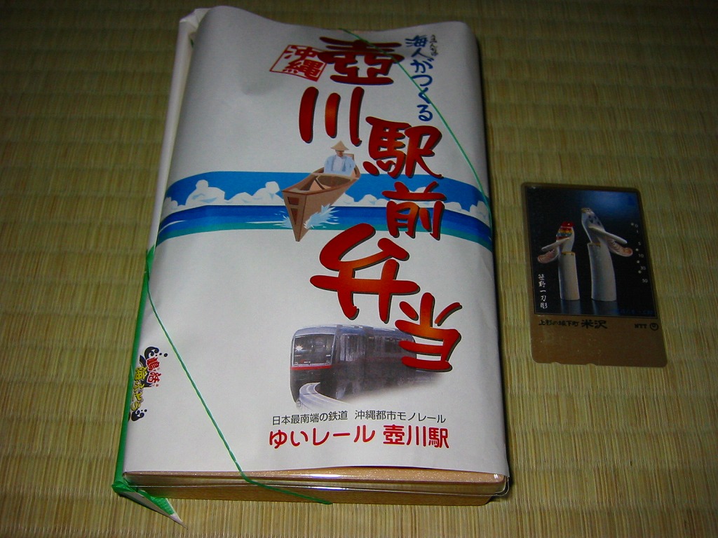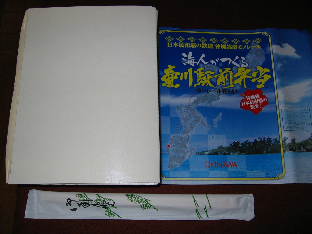 2003(平成15)年1月の京王百貨店の駅弁大会で、沖縄の駅弁として実演販売されたお弁当。A4サイズの掛紙を、大きな正方形の容器にかける。中身は半分が鶏そぼろと錦糸卵ともずくが載った御飯、半分がおかずで殻付海老2尾と海ぶどうにスギ(黒かんぱち)の頭。海ぶどうの好みはともかく、全面を殻に覆われて食べ方が分からないスギ、御飯のおかずにならない無味なもずく、そして容器内の空き地の多さや色遣いにはまだまだ改善の余地が大きいと感じた。話題先行型の「駅弁」。