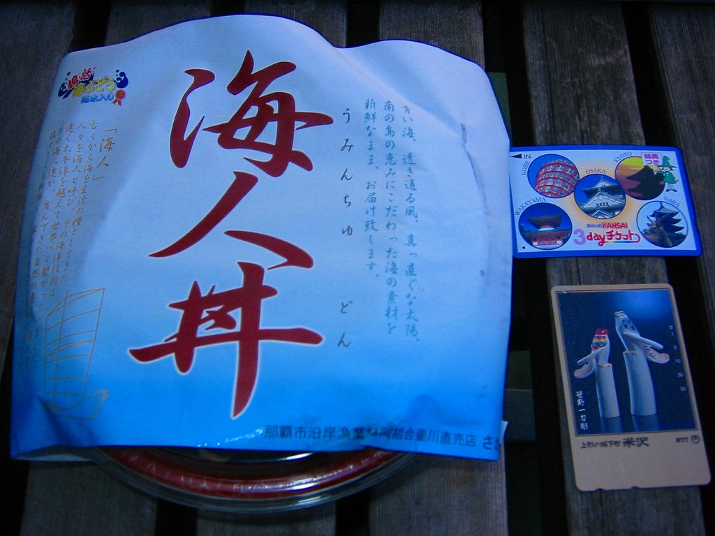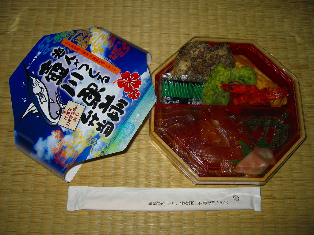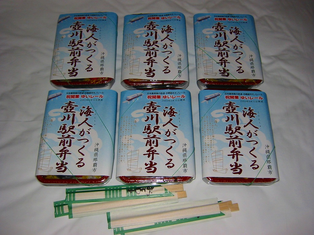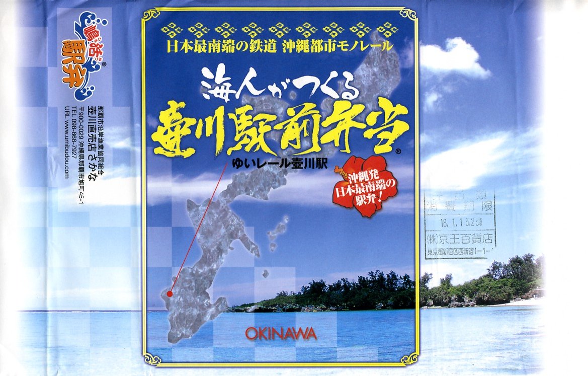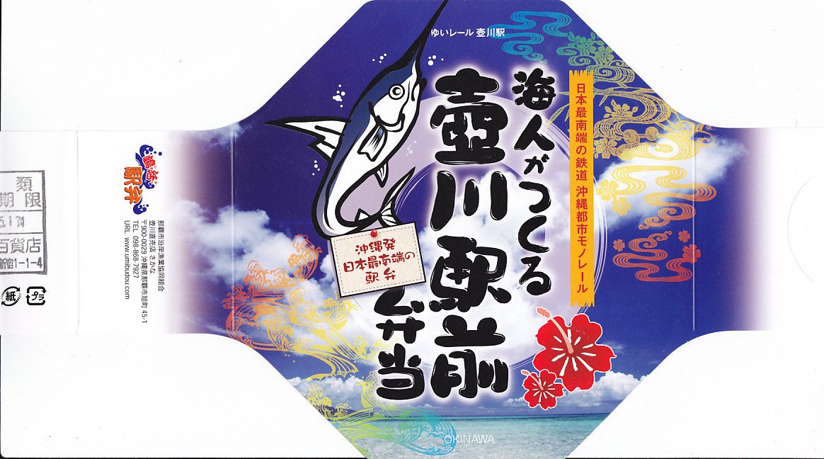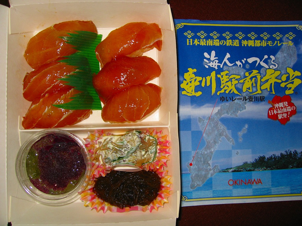 2004年1月の阪神百貨店の駅弁大会で、沖縄の駅弁として輸送販売されたお弁当。「海人がつくる壺川駅前弁当」と比較して、掛紙は現地版と同じ意匠のものを使用、容器は丼型の発泡材に変えて、中身は魚種不明の刺身を除いただけ、味は同等。現地での販売があるかは不明だが、その販売自体が漁協売店での注文調製なので、形態の変更は簡単にできそう。この時以来、この商品を見たことがない。