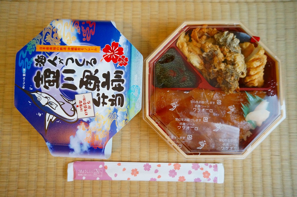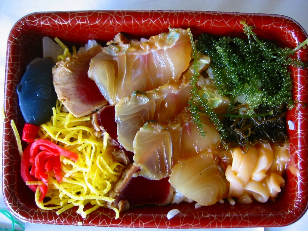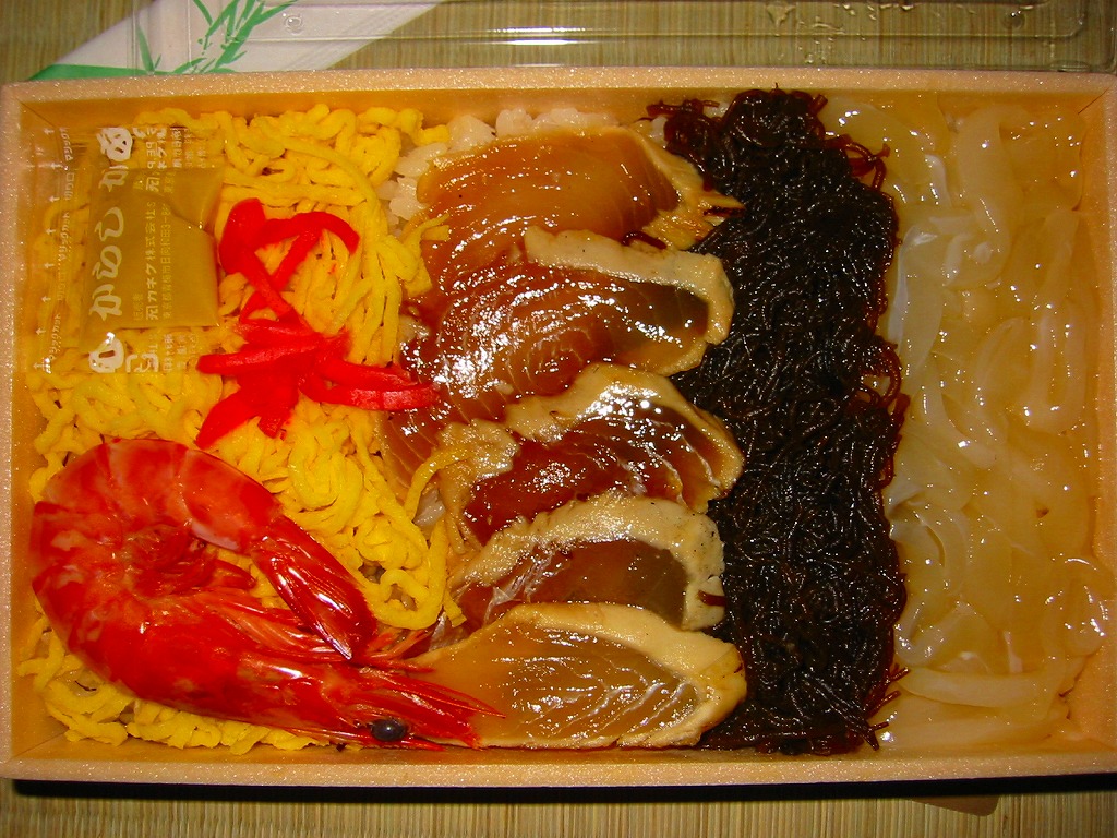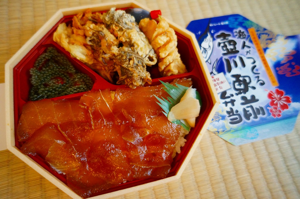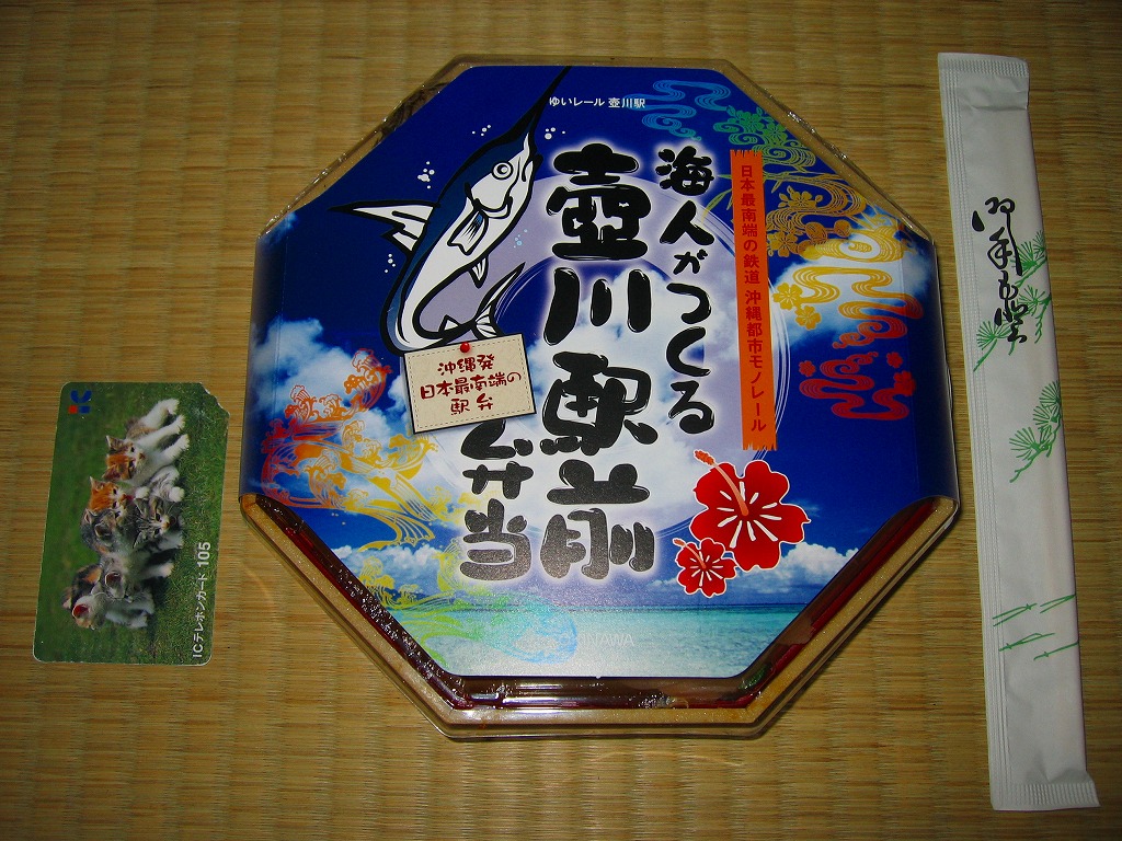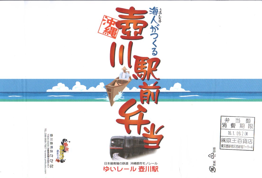 2004年1月の阪神百貨店の駅弁大会で、沖縄の駅弁として輸送販売されたお弁当。「海人がつくる壺川駅前弁当」と比較して、掛紙は現地版と同じ意匠のものを使用、容器は丼型の発泡材に変えて、中身は魚種不明の刺身を除いただけ、味は同等。現地での販売があるかは不明だが、その販売自体が漁協売店での注文調製なので、形態の変更は簡単にできそう。この時以来、この商品を見たことがない。