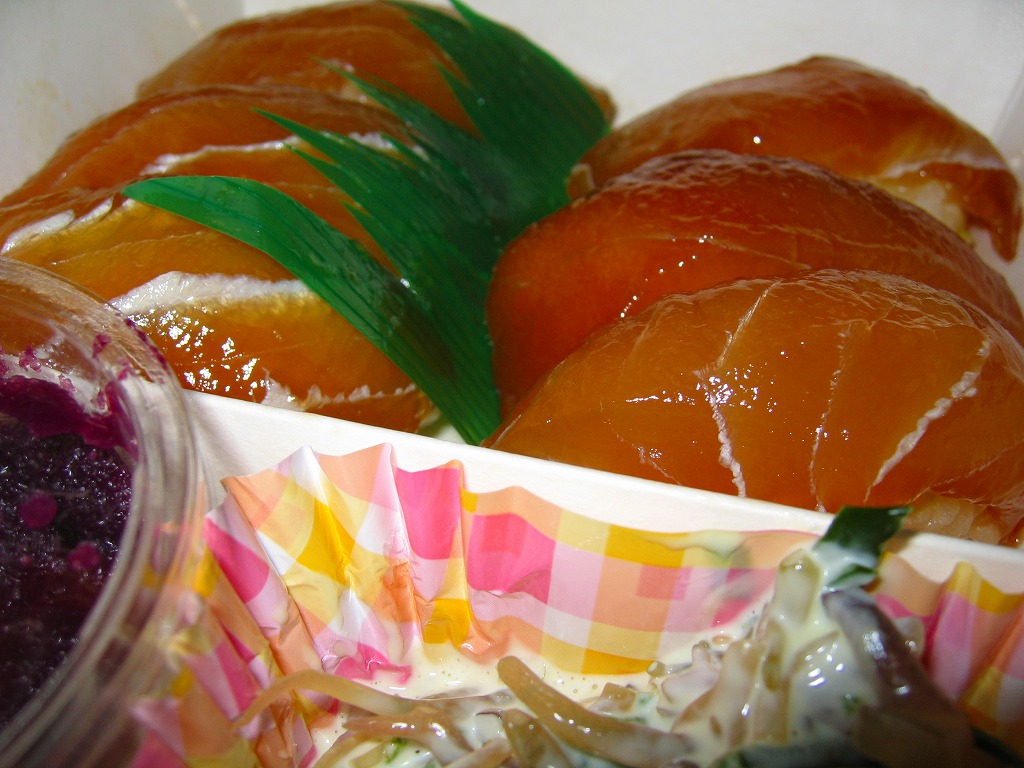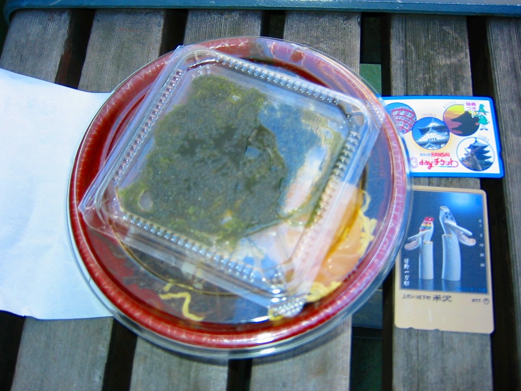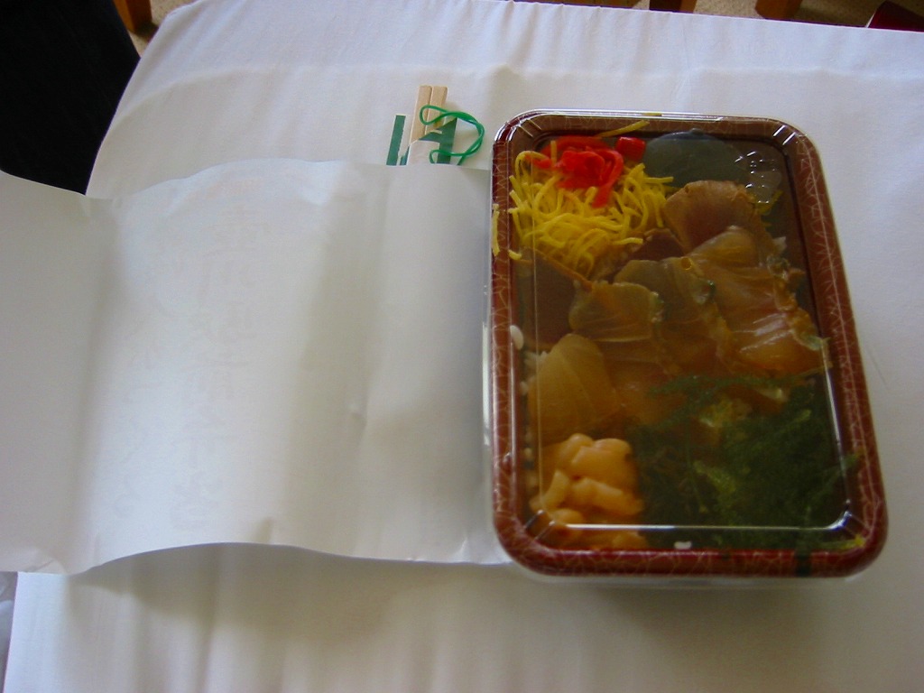 なお、JTB時刻表2005年8月号によれば、現地で売られるものはこれと異なり、掛紙は当館収蔵2004年版、容器は発泡材枠な長方形の容器で、中身は寿司8個だけ詰めて、価格は800円である模様。つまりこれは、催事専用のお弁当。