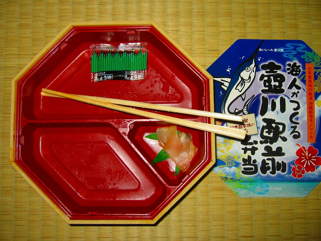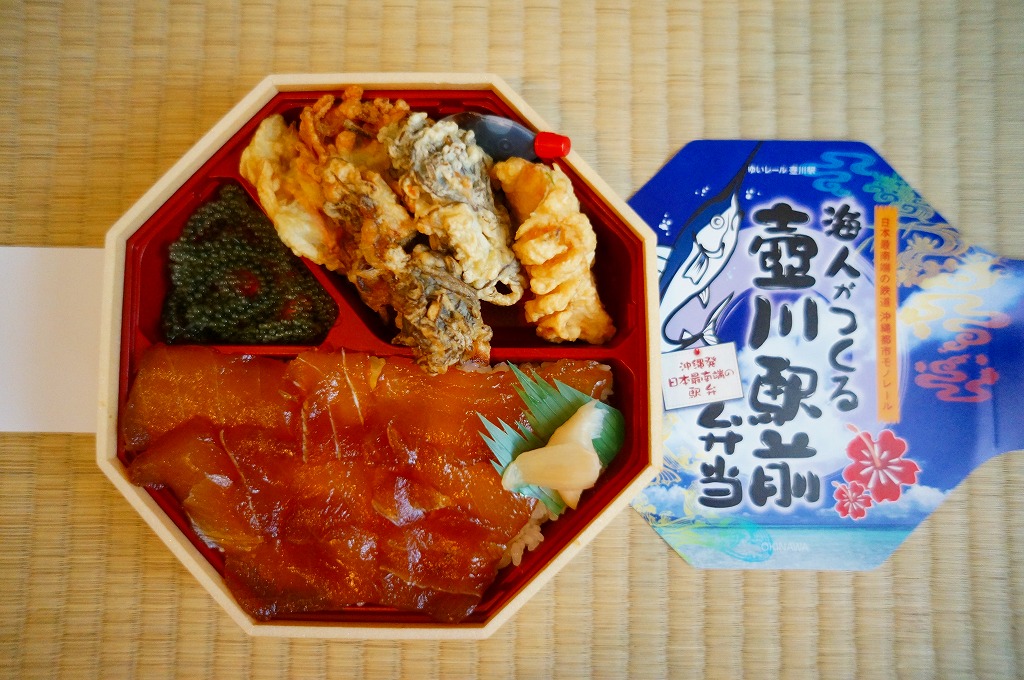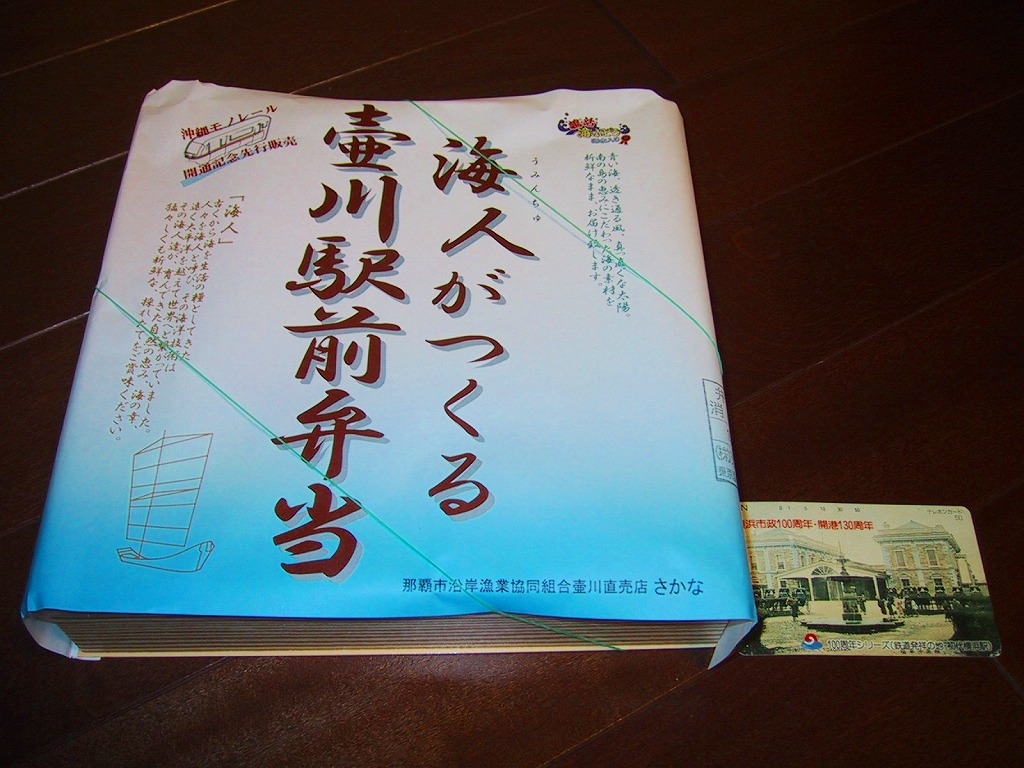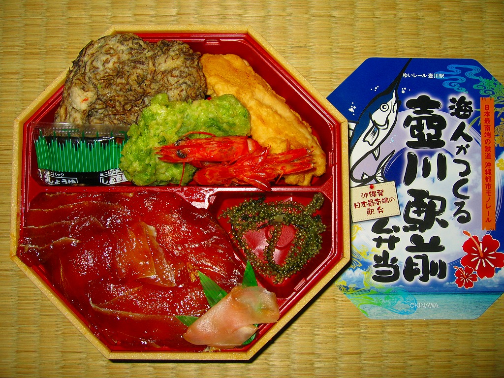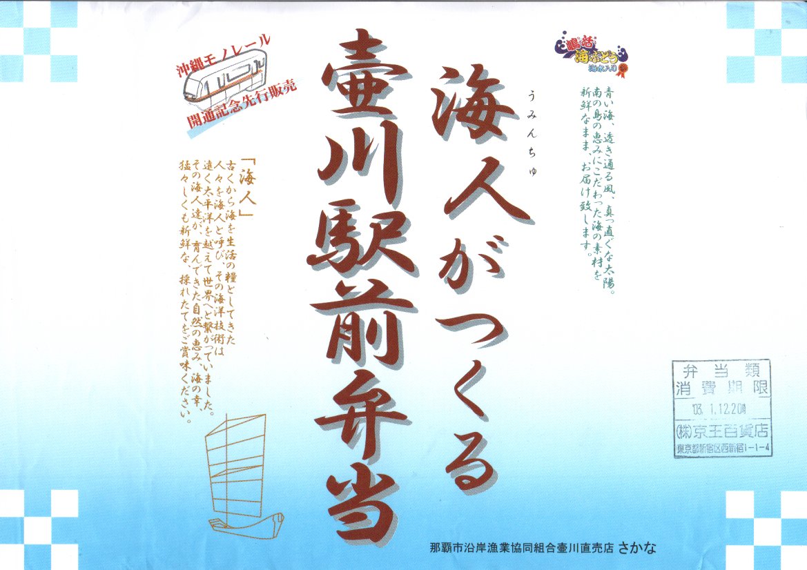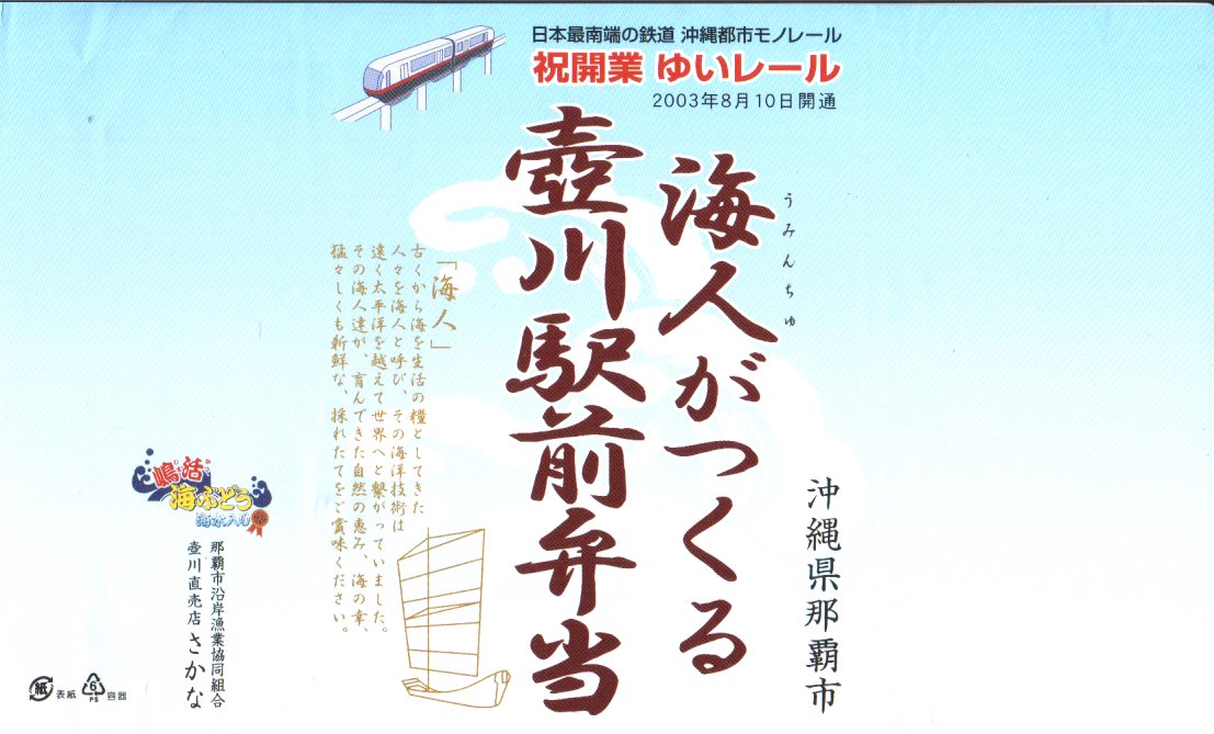 那覇市沿岸漁業協同組合の壺川支部鮮魚直売店が、県内戦後初の軌道系交通機関として2003年8月開業予定の沖縄都市モノレール「ゆいレール」の壺川駅に近いことから、県内産の海産物を使用したお弁当を駅弁にと考案したもの。ただし「駅前弁当」であるので駅での販売はなさそう。全線で27分しかかからないモノレールに駅弁など不要とも言えるが、駅弁のない沖縄県なのでせめて空弁として成長できないかと思う。その際には「那覇空港駅弁」に。