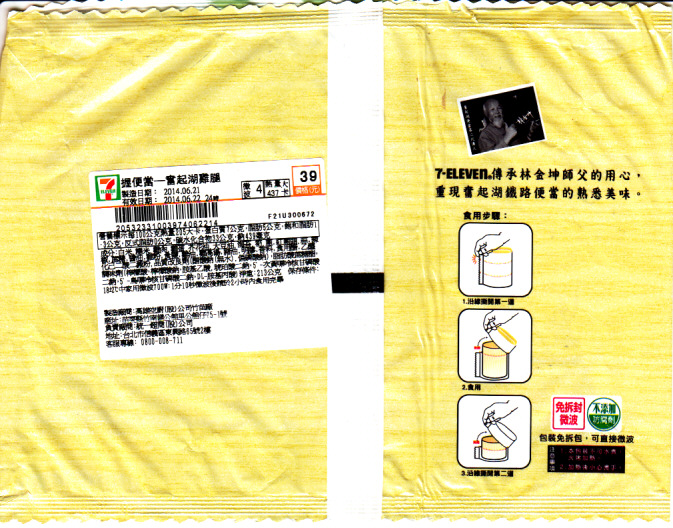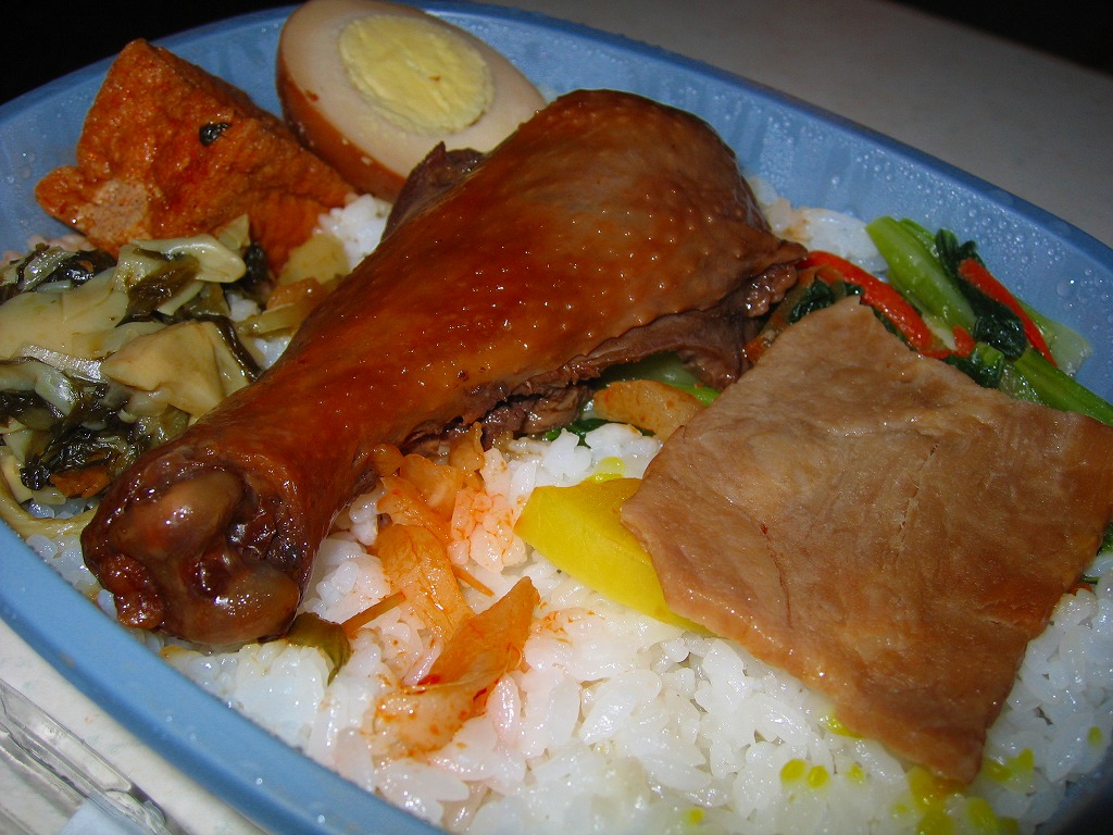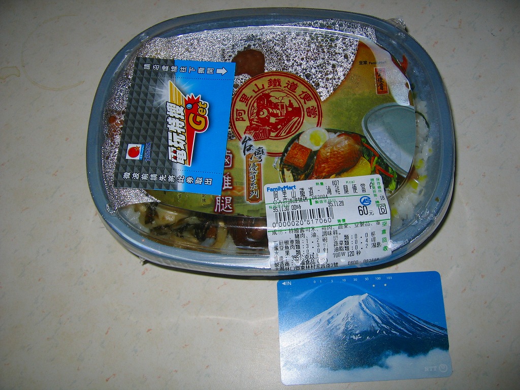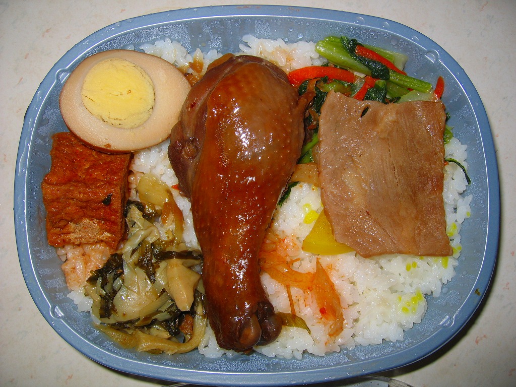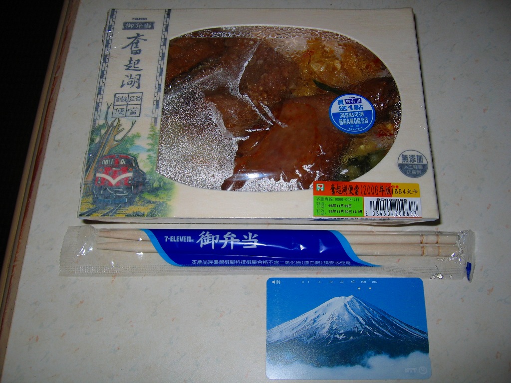 台湾でもコンビニ大手の全家便利商店(ファミリーマート)の、台北駅近くの店舗で購入したコンビニ弁当。楕円形のプラ製容器に白御飯を詰め、その上に骨付き鶏肉、薄い豚肉、煮玉子半分、高菜その他の野菜炒め、タクアン、揚げ豆腐を載せる。ちょっと安っぽいけれど、奮起湖弁当の特徴が再現されている。風味は日本のコンビニ弁当とたいして変わらない。つまりクセがない。