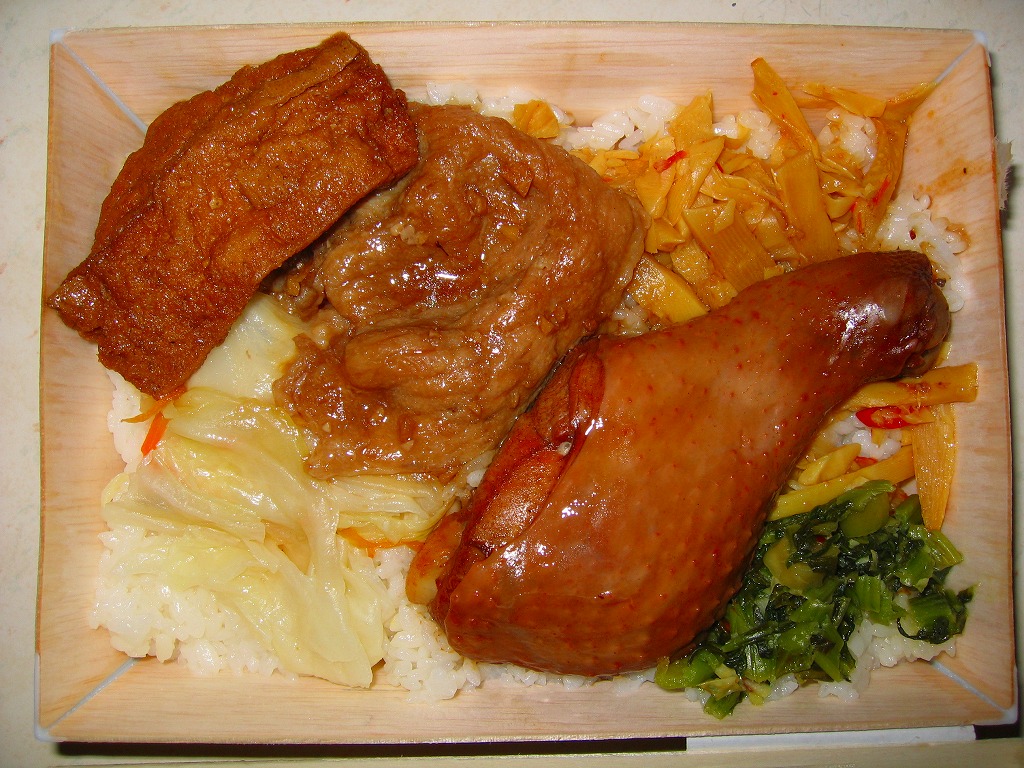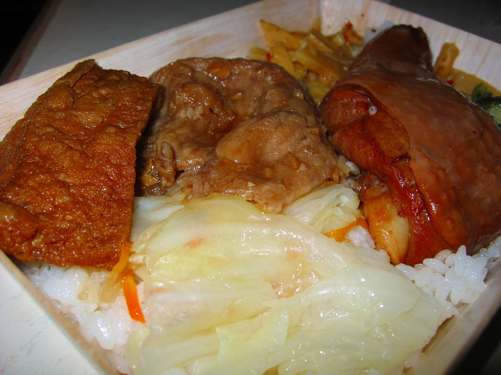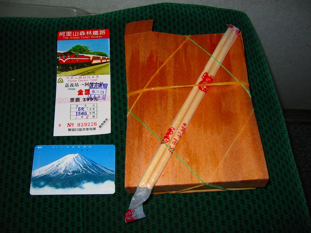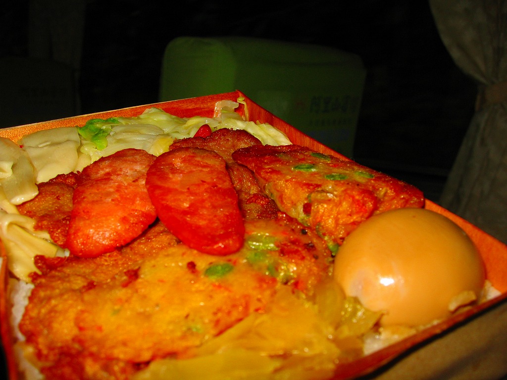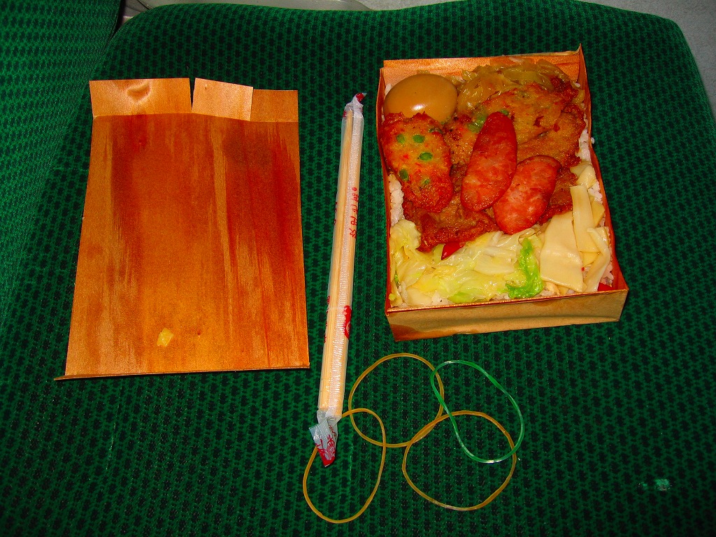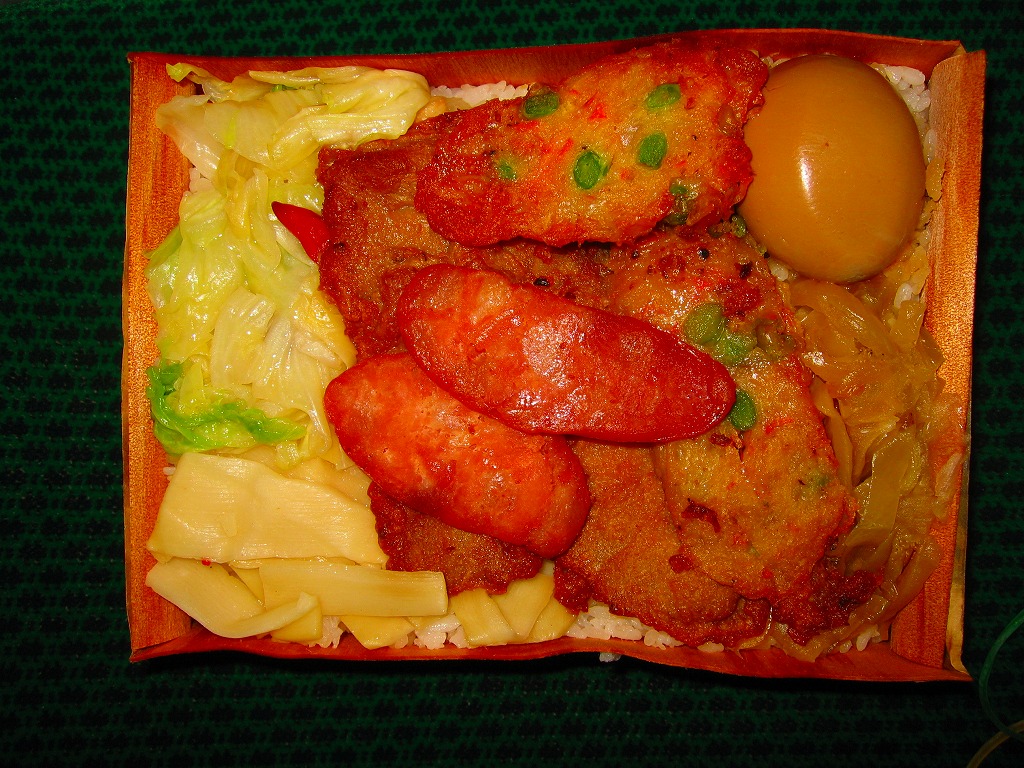 2006年の訪問時、阿里山森林鐵路の奮起湖駅で立ち売りされていたお弁当。かなり素朴な経木の容器に竹箸を置いて、4本の輪ゴムできっちりしばる。中身は御飯の上ににキャベツ、タケノコ、タマネギの炒めもの、薩摩揚げ2切れ、ソーセージ2切れ、煮玉子1個、広く薄い揚げ豚肉1切れ。
