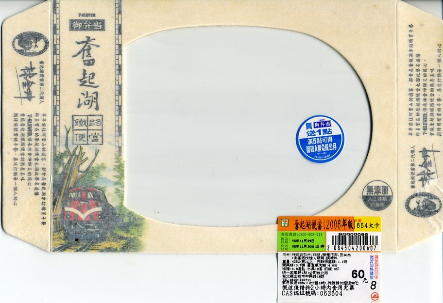 台湾でもコンビニ大手のセブンイレブンの、台北駅近くの店舗で購入したコンビニ弁当。経木を薄紙とプラスティックで組み立てた台湾駅弁らしい形状の容器を使用、そのフタには阿里山森林鉄路の列車と神木が描かれる。中身は白御飯の上に高菜やキャベツ等の野菜炒め、揚げ豆腐、骨付き鶏肉、豚焼肉を載せて、奮起湖弁当の特徴を再現。風味は日本のコンビニ弁当とたいして変わらない。つまりクセがない。