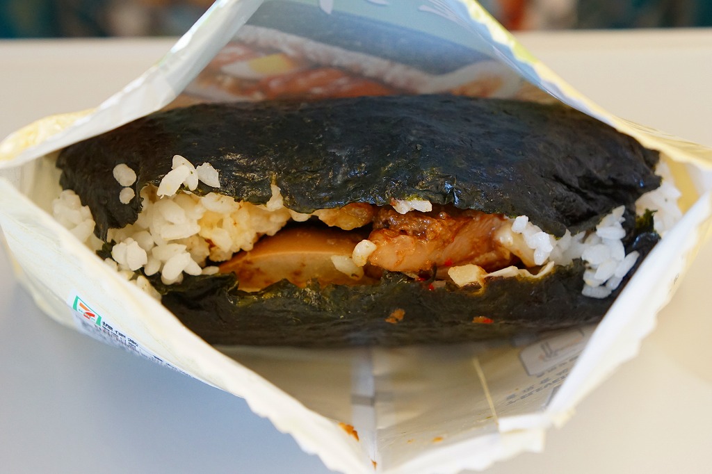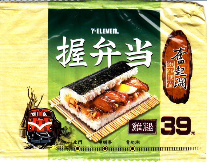 台湾でもコンビニ大手のセブンイレブンで、2014年の訪問時に買えた奮起湖弁当。便當(弁当)を名乗るが、包装や中身のとおり、これはコンビニおにぎり。タレの焼き鳥や煮玉子などの具が、イラストのとおり海苔を貼った飯に巻かれていた。包装紙には阿里山森林鐵路の機関車や駅名があって、鉄道ムードたっぷり。