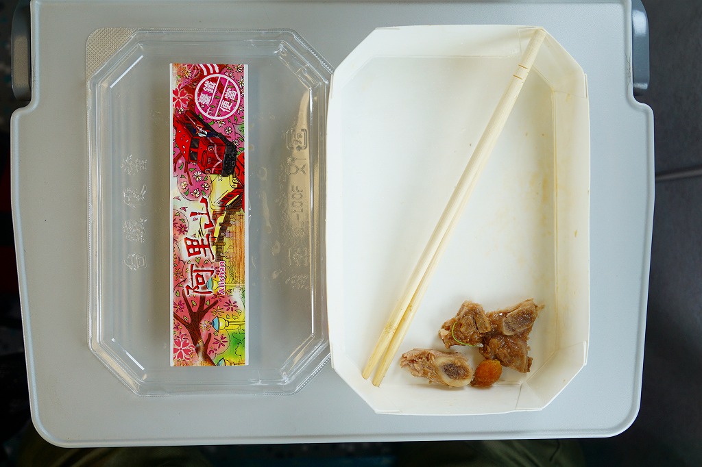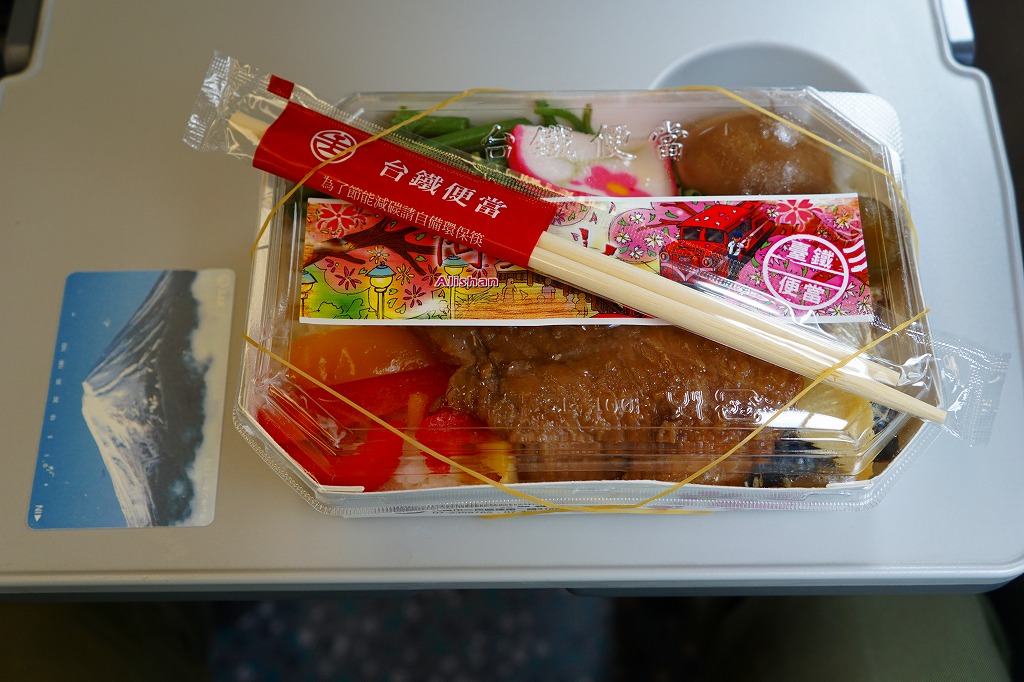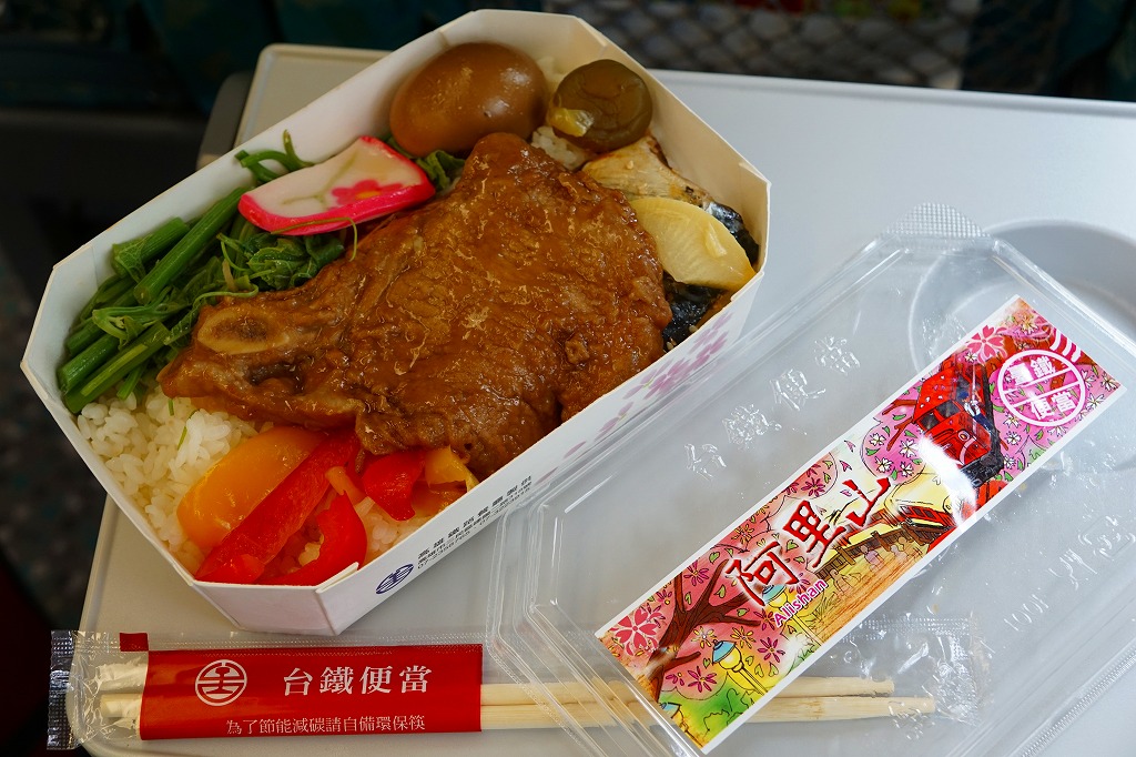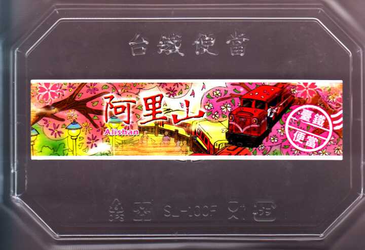 阿里山を名乗るが、台湾鉄路管理局(台鉄)の高雄エリアの駅弁である。売店の掲示によると「午餐限定」つまり昼飯限定である模様。角を落とした長方形の容器に、排骨と煮玉子、タケノコとパプリカ、ゼンマイのようなもの、かまぼこ、梅そして焼サバを入れていた。北回帰線の南側でサバとは驚いたが、あるいは他の種の魚か。世界有数の登山鉄道であり、掛紙代わりのシールに描かれる阿里山森林鐵路は、災害により2009年8月からずいぶん長い間、全通できていない。