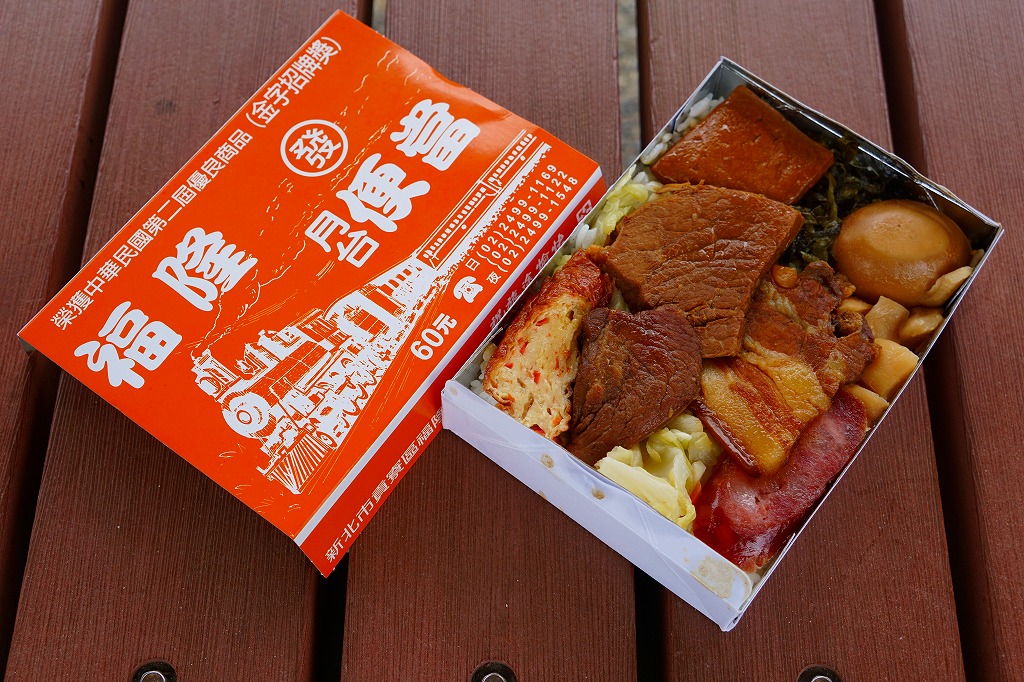 台北市内のファミリーマートで買った福隆弁当。素材は駅弁らしく、しかし現地販売版とは少々異なる紙箱には、駅名標と駅弁立売と普通電車が描かれる。中身は白御飯を詰め、豚角煮、野菜炒め、サラミ、煮玉子、薩摩揚、固い豆腐のようなものを載せる、つまり福隆弁当。排骨飯よりこちらのほうが、日本人の口に合うと思うし、コンビニ弁当なのでさらにクセが小さい。