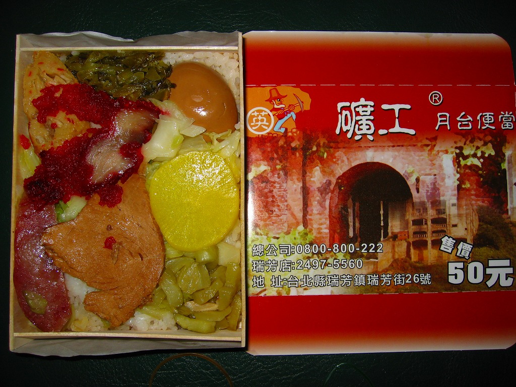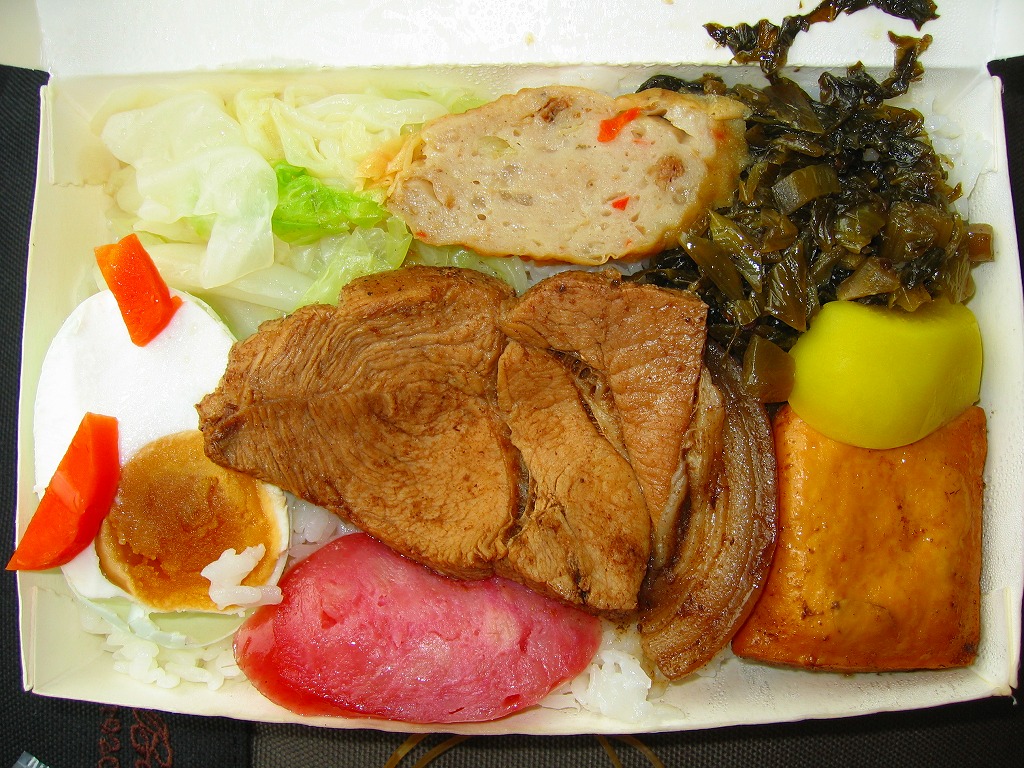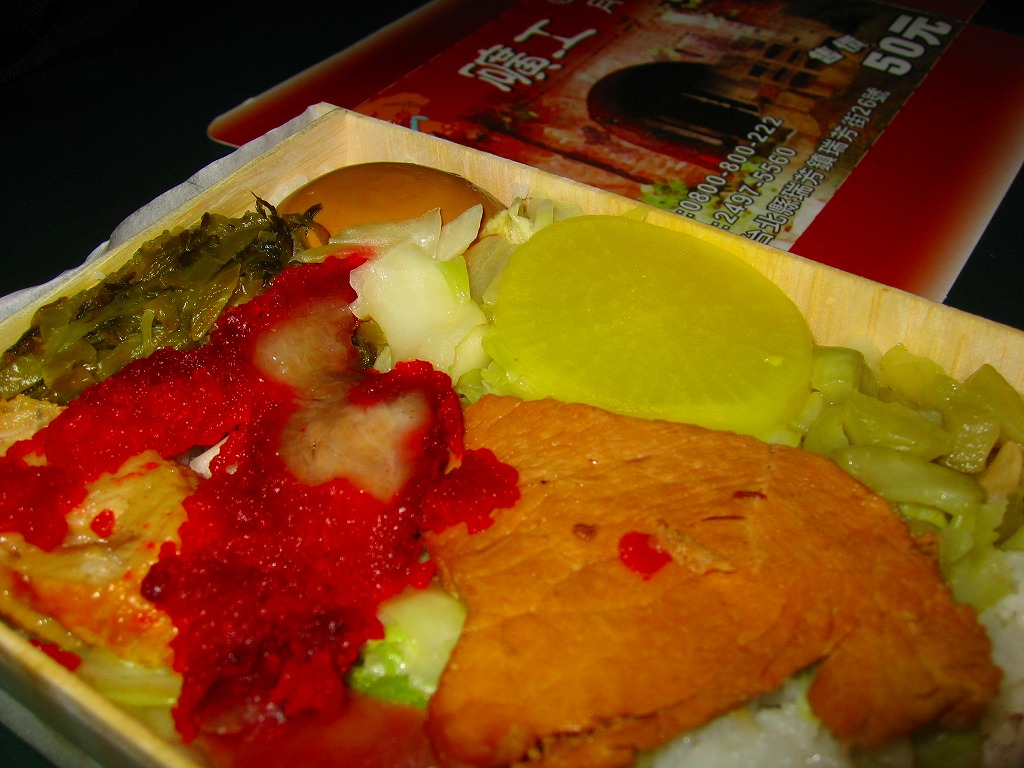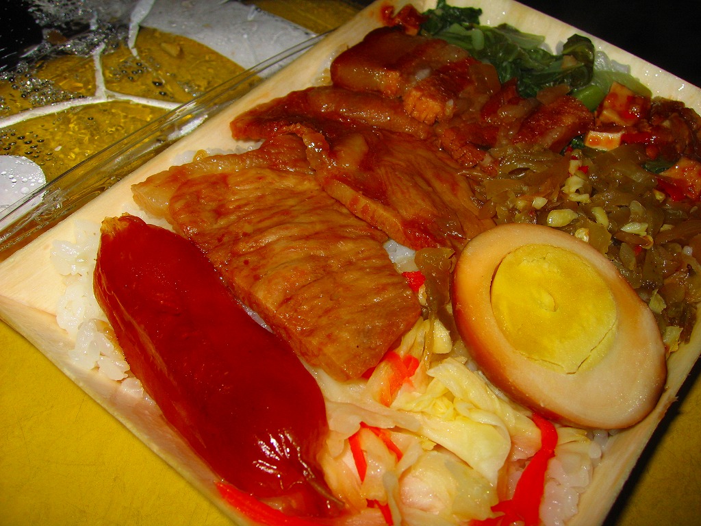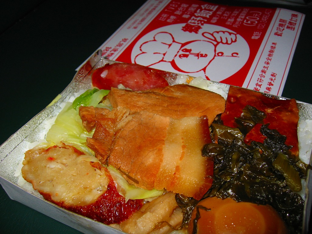 阿里山森林鐵路の阿里山駅(2006年時点で休止中)に近いコンビニで買ったお弁当。紙を貼って組み立てた経木の容器に透明なふたをかけて、商品名や食品表示ラベルを貼ってラップで包む。中身は白御飯の上に煮玉子半分、野菜炒め3種、豚肉4種などを載せるもの。電子レンジで加熱のアツアツ状態で食べたので、駅弁というより屋台や食堂の味。
