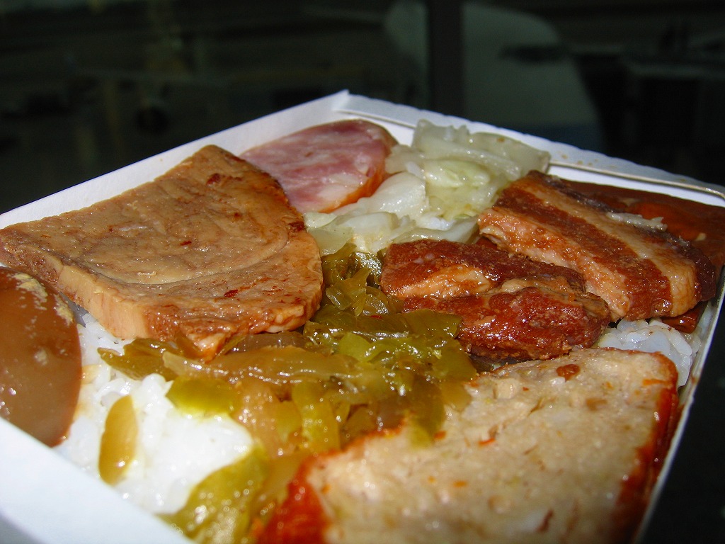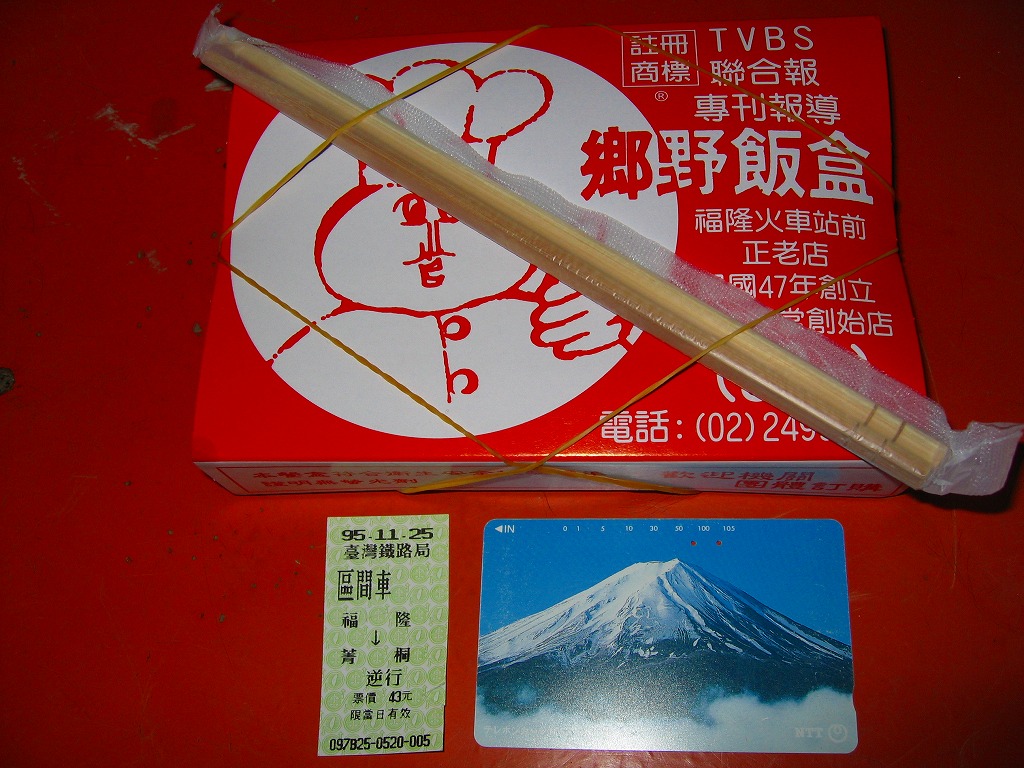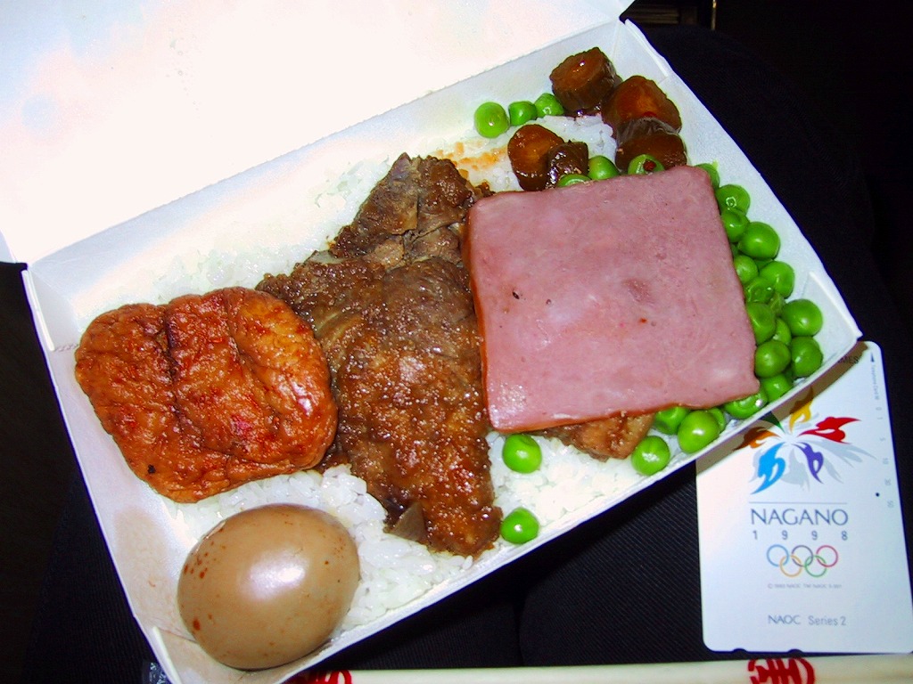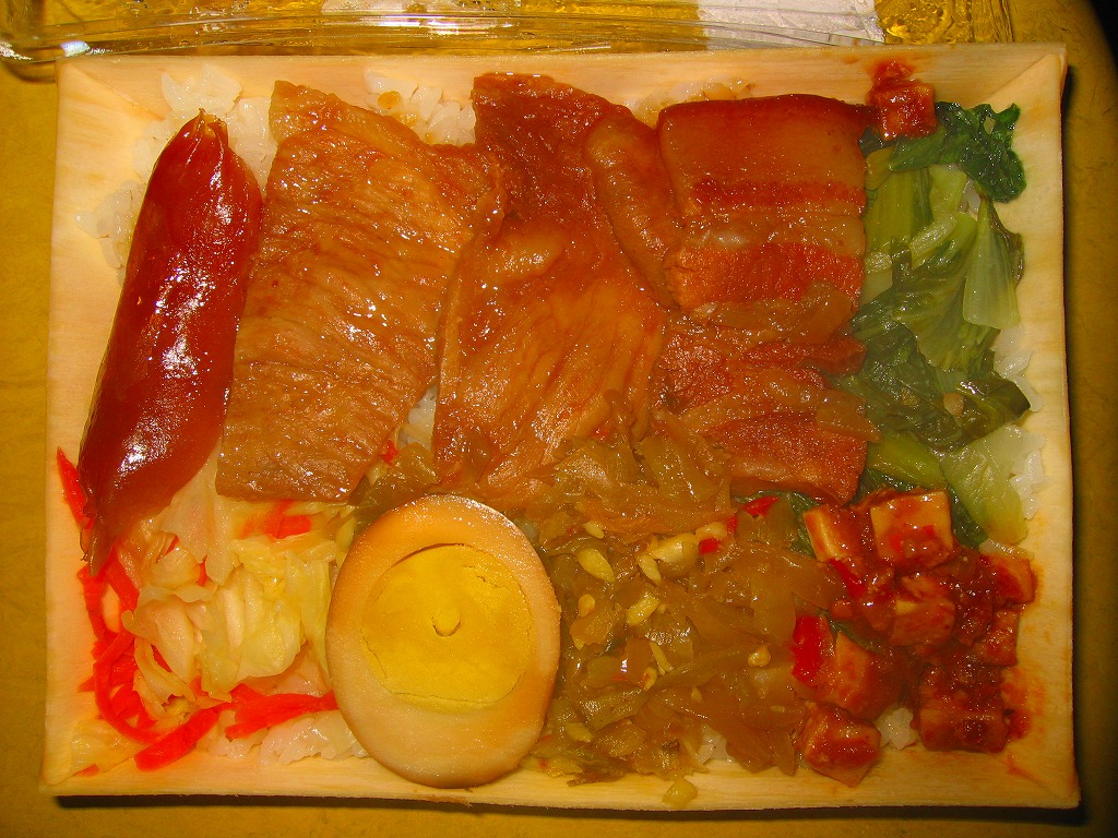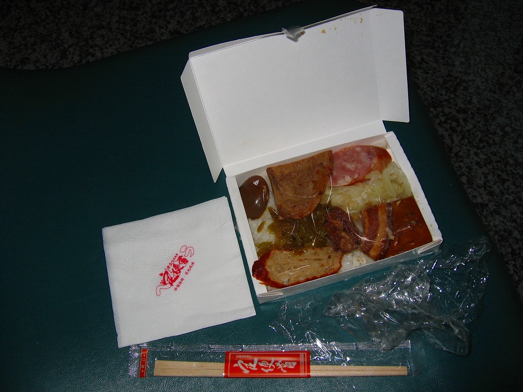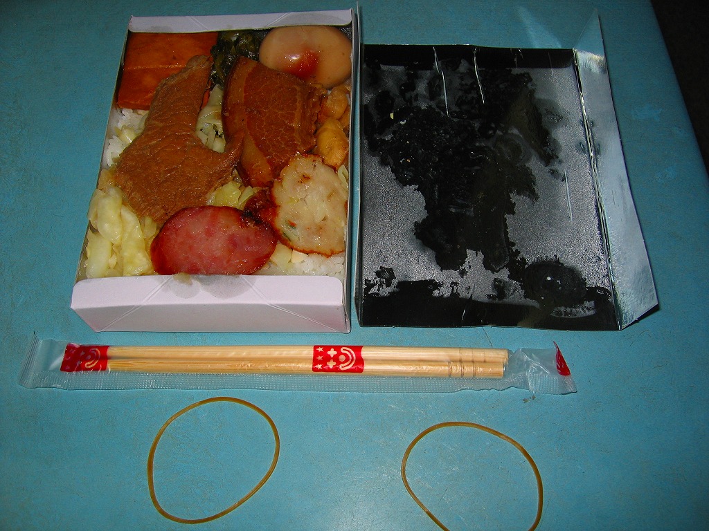 阿里山森林鐵路の阿里山駅(2006年時点で休止中)に近いコンビニで買ったお弁当。紙を貼って組み立てた経木の容器に透明なふたをかけて、商品名や食品表示ラベルを貼ってラップで包む。中身は白御飯の上に煮玉子半分、野菜炒め3種、豚肉4種などを載せるもの。電子レンジで加熱のアツアツ状態で食べたので、駅弁というより屋台や食堂の味。