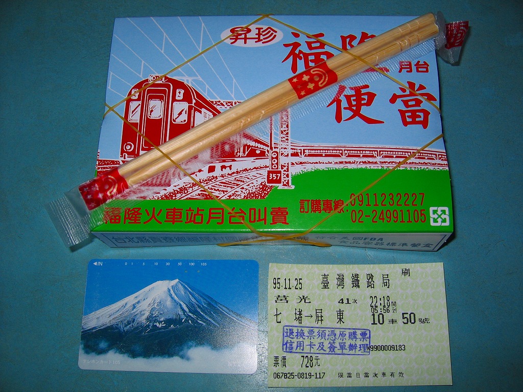 この駅弁は台北発花蓮行「自強号」の車内販売で購入した。車内販売ではこの弁当とペットボトルの水といくつかの缶飲料のみを販売し、日本国内の車内販売のようにコーヒーやサンドイッチにビールやおつまみは売りに来ないようだ。そして、車内のゴミを根こそぎ集める係員も乗車しており、持ち帰るつもりの容器は寝ているスキに回収されてしまった。