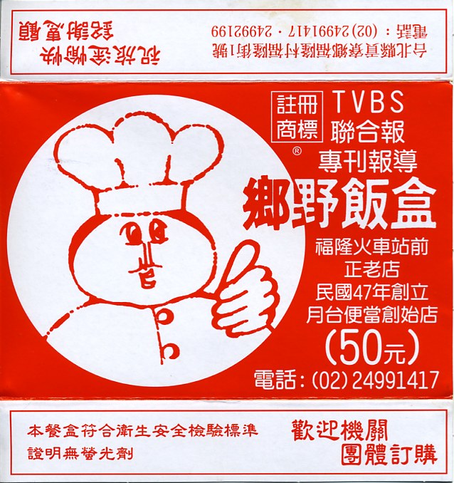 福隆駅前に何軒もある弁当屋のうち、最も駅に近く、訪問時に最も賑わっていた店で買った福隆弁当。駅弁と同じ構造の容器を使用、フタにはコックの絵とおそらくテレビで紹介された旨の宣伝文句を書く。中身は駅弁とだいたい同じで、具が少々大きく、キャベツ炒めの緑色が色彩を補い、風味もなんとなく、いい感じ。これを販売箇所を兼ねる店奥の調理場で激しく量産していた。