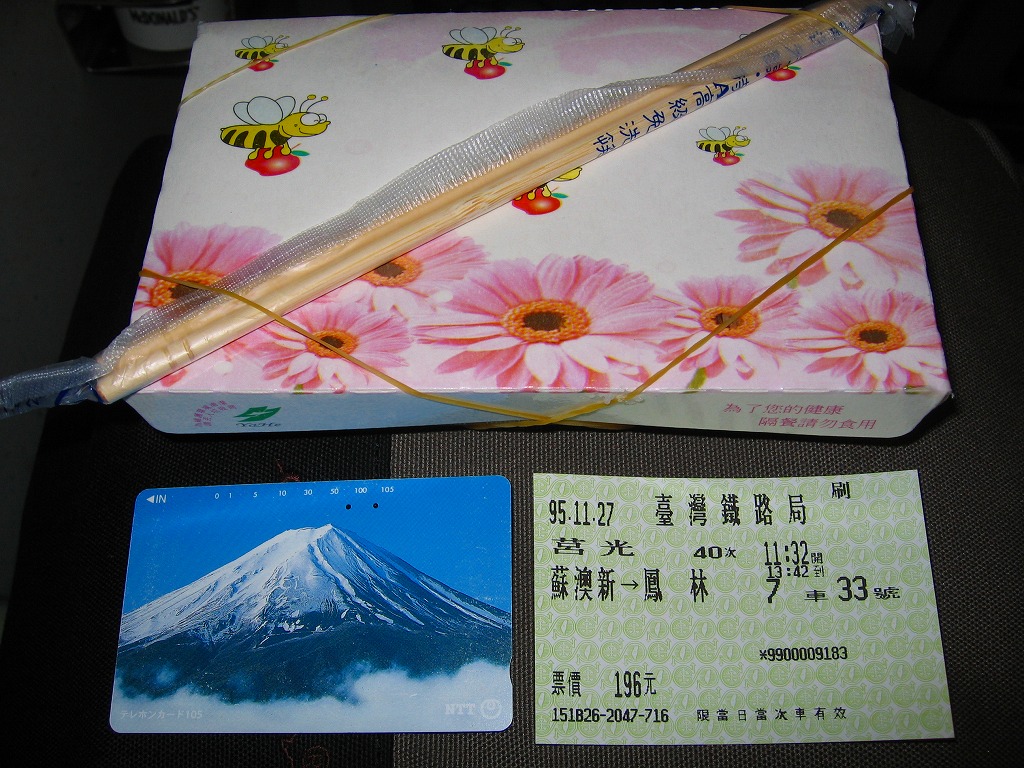 2006年の訪問時でも、台湾には非正規の車内販売が存在したらしい。車販で買った弁当を食べて腹をこわしたので台鉄に苦情を言ったら正規業者に該当がないとか、そんな販売人が台鉄の弁当の空き容器を洗浄し再利用することを防止する切り込みが付いているとか。日本でも昭和30〜40年代頃には東北本線などで出没していたそうだから、それだけ鉄道の元気がよい証拠。