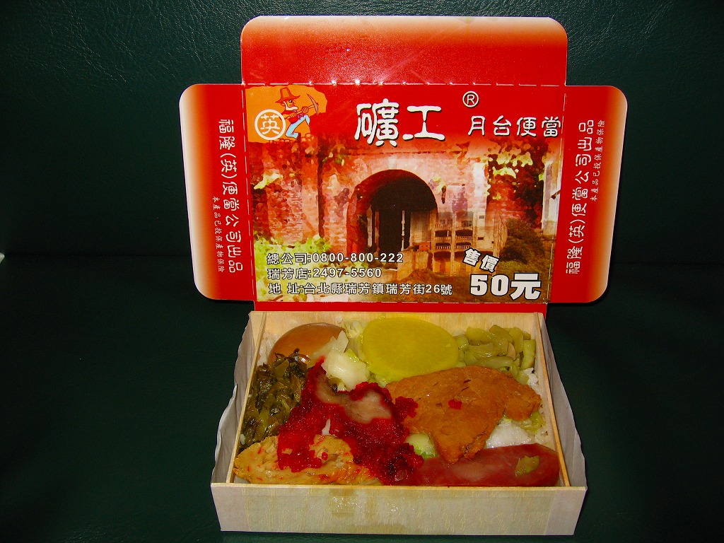 長方形の薄い紙箱に、自強号用電車の版画を描いた紙ふたをかけて、竹箸を置いて輪ゴムでしばる。中身は白御飯の上に高菜やキャベツの炒め物を敷き、煮玉子1個、固い豆腐のようなもの、薩摩揚げを添え、豚肉を揚げ、角煮、サラミ、アメリカンドッグの4種で載せる。風味は台湾駅弁らしく、だいぶ油っぽい。