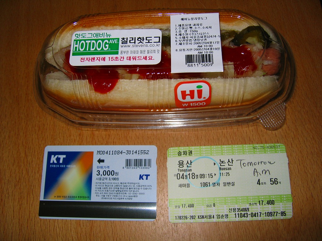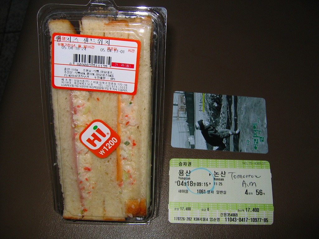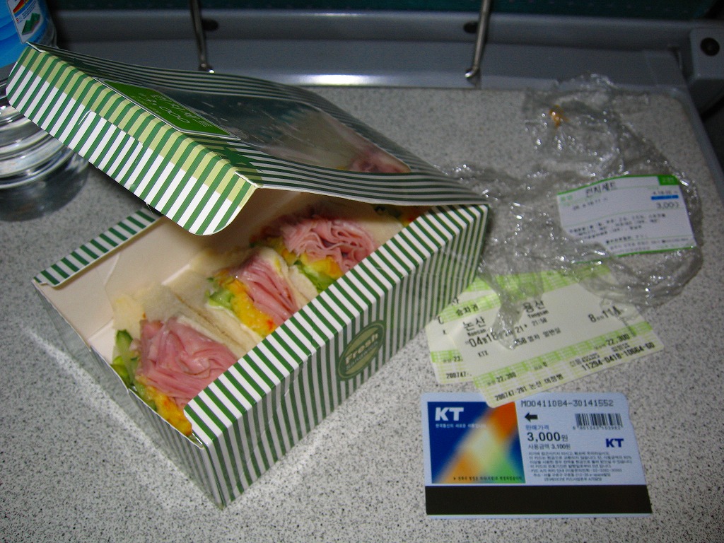このサンドはKTX車内で消費。フランスのTGVをまるごと移籍して2004年3月に開業した、世界最高速タイの時速300km営業運転を誇る韓国鉄道の顔であるが、狭い車内と高い運賃に不具合の続発など評判があまり芳しくないようで、利用者は見込みの半分程度だという。駅電光掲示板の空席情報でも、セマウルやムグンファが満席でもKTXは数百席の空席数を示し、実際に空いていた。今後に予定される第二期開業と国産車導入で挽回してくるだろう。