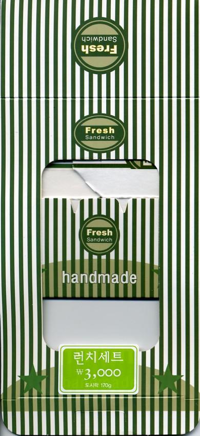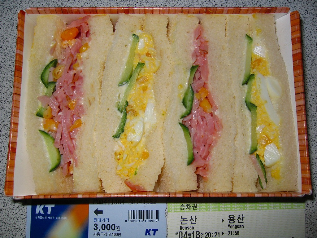 龍山駅のKTXやセマウル号などが発着するホーム上のファミリーマートで買った箱入りサンドイッチ。ハム・玉子・キュウリ・レタスのサンドイッチを4切れ、小さな紙箱に直角二等辺三角形の直角を上に詰めるもの。その価格と容姿から高級系なのだろう、コンビニサンドやソウル駅収穫品より少々のみずみずしさと高級感がある。同じタイプの商品がもう1種類あった。
