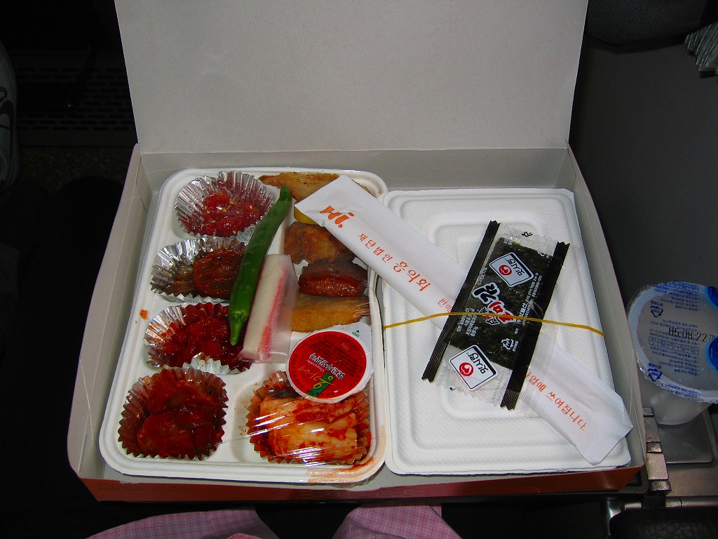 韓国でようやく出会えた駅弁らしい雰囲気の弁当に喜んだものの、中身で赤いものはこの世のものとは思えない辛さで、白菜とイカを除き残さざるを得なかった。これにチリソースまで付いているのだから恐ろしく、日本人との味覚の差は相当に大きい。なお、車内販売では箱入りサンドイッチも積んでいたが駅売りと同じ商品の模様。キンパブの車内弁当もあるそうだが、今回は見つからなかった。