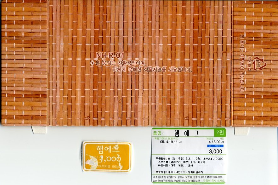 龍山駅のKTXやセマウル号などが発着するホーム上のファミリーマートで買った箱入りサンドイッチ。ラップを巻いたフタなし紙箱に長方形の、キュウリが入る刻みハムサンドと玉子サンドが2切れずつ。味はコンビニサンドやソウル駅収穫品より少々のみずみずしさと高級感がある。名前は「ハムエッグ」の音読みか。同じタイプの商品がもう1種類あった。