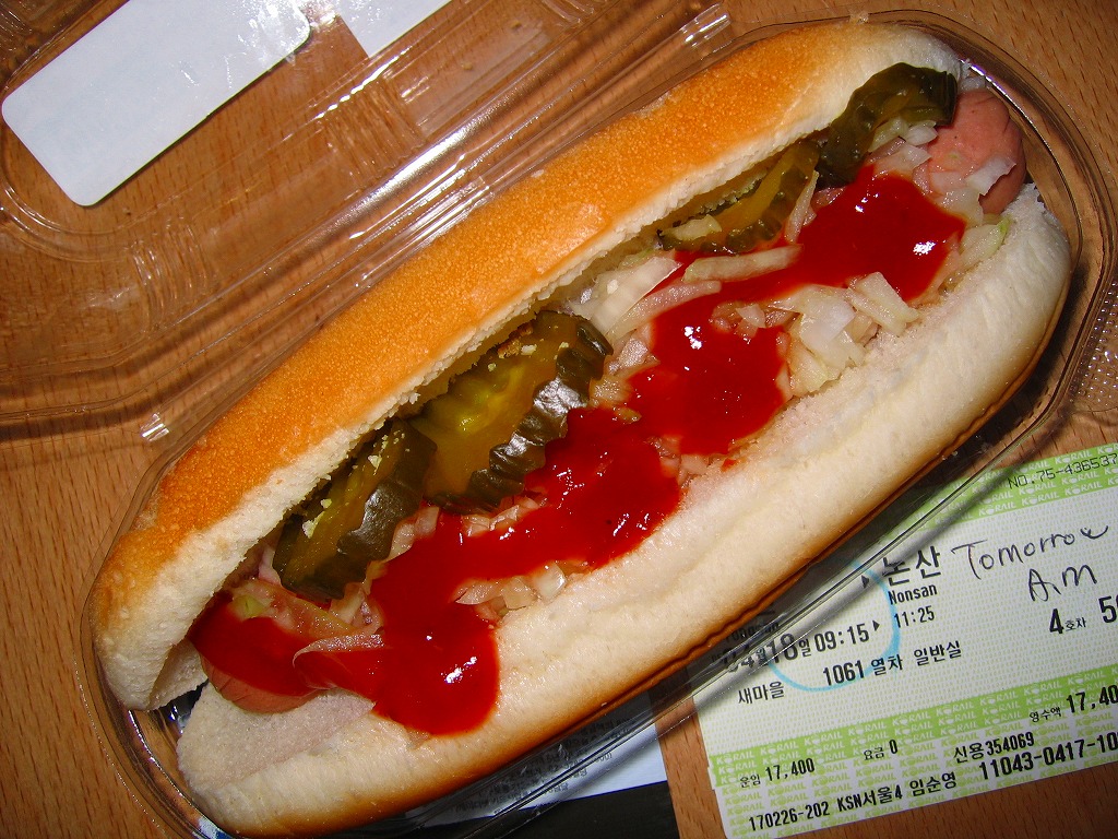 2005年の訪問時に、ソウル市にある龍山駅のコンビニキオスクで見付けたホットドッグ。他にキンパブとサンドイッチもあったが、前日にソウル駅で買ったものと同じだった。長径十数センチのパンにソーセージ1本とピクルス約4切れを挟み、タマネギみじん切りをまぶしチリソースをかけた、つまりホットドッグを同型の透明プラ容器に入れ、商品シールと食品表示シールとキオスクの値札を貼ったもの。名前は「チリホットドッグ」の音読みか。しかし分量や味は日本のコンビニ商品に劣る感じ。