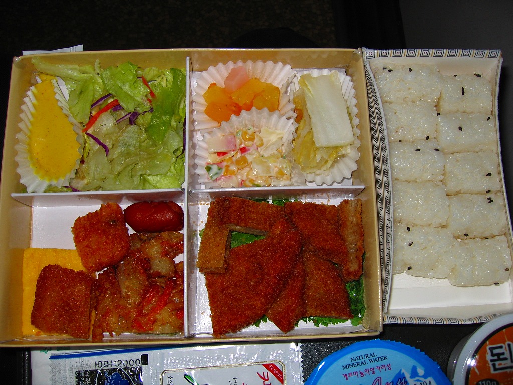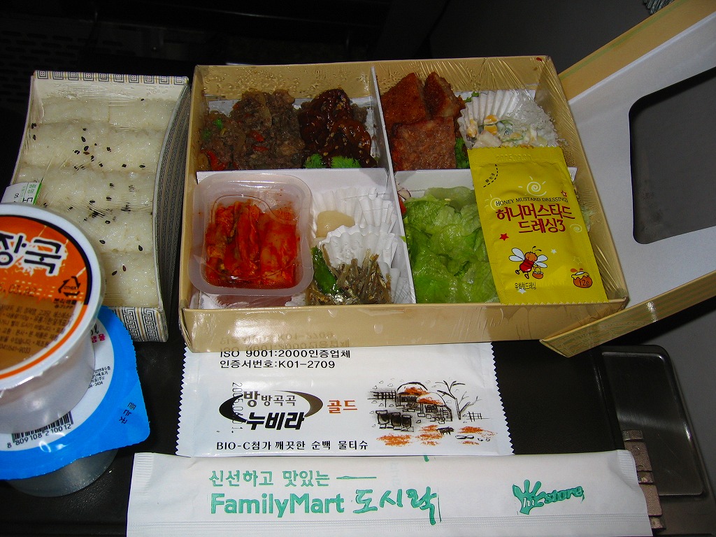 ソウル市にある龍山駅の、KTXやセマウル号などが発着するホーム上のファミリーマートで買ったお弁当。総ボール紙製の長方形の容器は松花堂風に四分割され、中身は生野菜サラダ、キムチ・ラッキョウ・小魚和え、何かの揚げ物数種とカニカマコーンサラダ、牛すき焼き肉とレンコン煮。これに別のラップ包み紙箱で俵飯を、航空機内食風プラ製カップで水と味噌汁?を付ける。