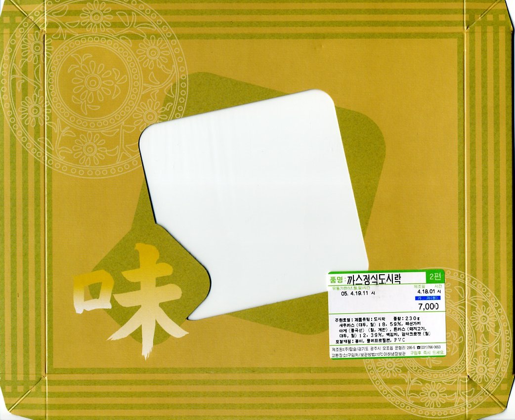 カスはカツ、ジョンシクとは定食の意味だそうな。トシラックは弁当。食品表示ラベルによると中身はエビカツ、海鮮かき揚げ、トンカツ、コロッケなど。味は薄めで辛さがなく、韓国食の事前のイメージとだいぶ異なる。なお、割りばしの袋にはゴミ袋も封入され、別に紙ナプキンも付いている。この2種で、ホーム上ファミリーマートの取扱弁当のすべてである。