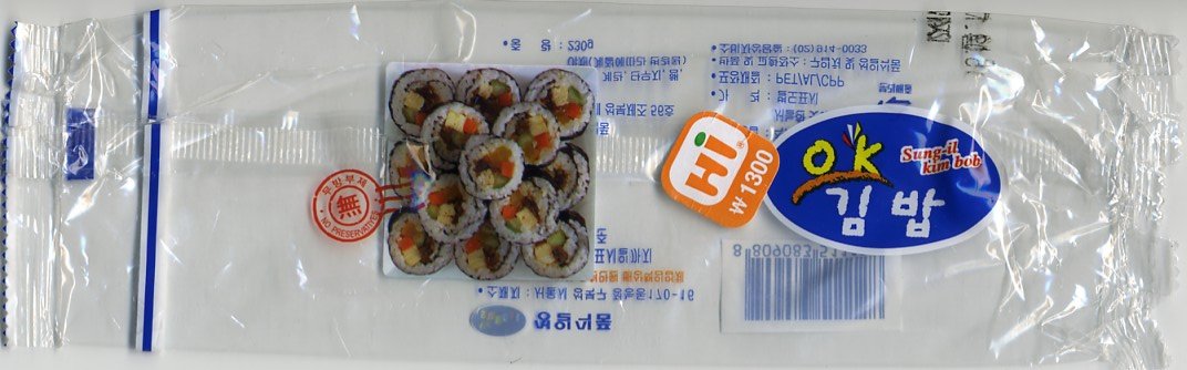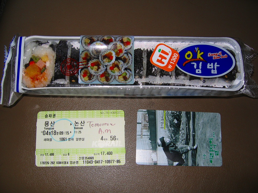 2005年の訪問時にソウル駅のキオスクで見付けた、1種のみ取り扱いの韓国風海苔巻。ハムと人参と玉子焼とキャベツ?とキムチ?を、塩気と油気がある韓国風海苔で巻いた、日本の細巻と太巻の中間くらいの太さで長さは20センチ程度のキンパブ(韓国風海苔巻)1本をトレーに入れてビニール袋に入れる。味は辛くなく、御飯も具も軟らかく風味がよく分からない感じ。