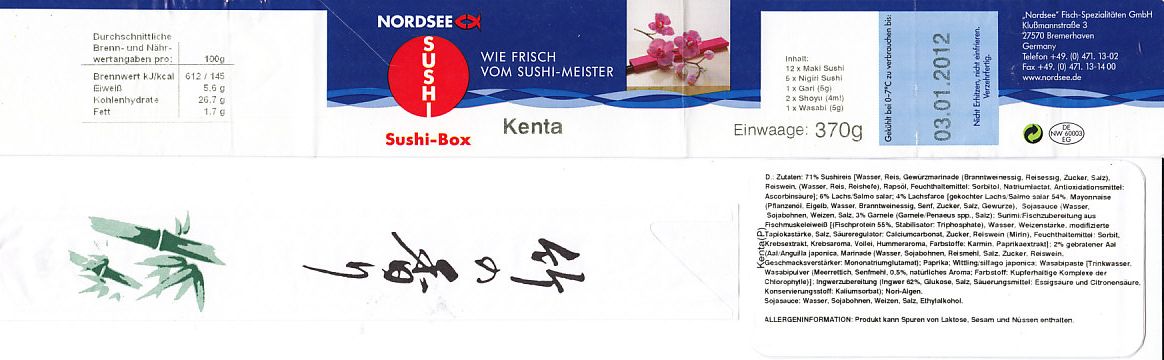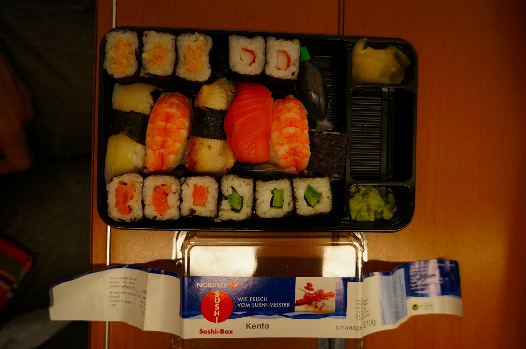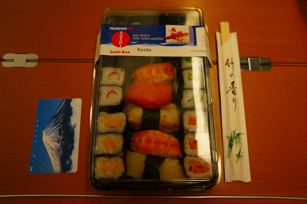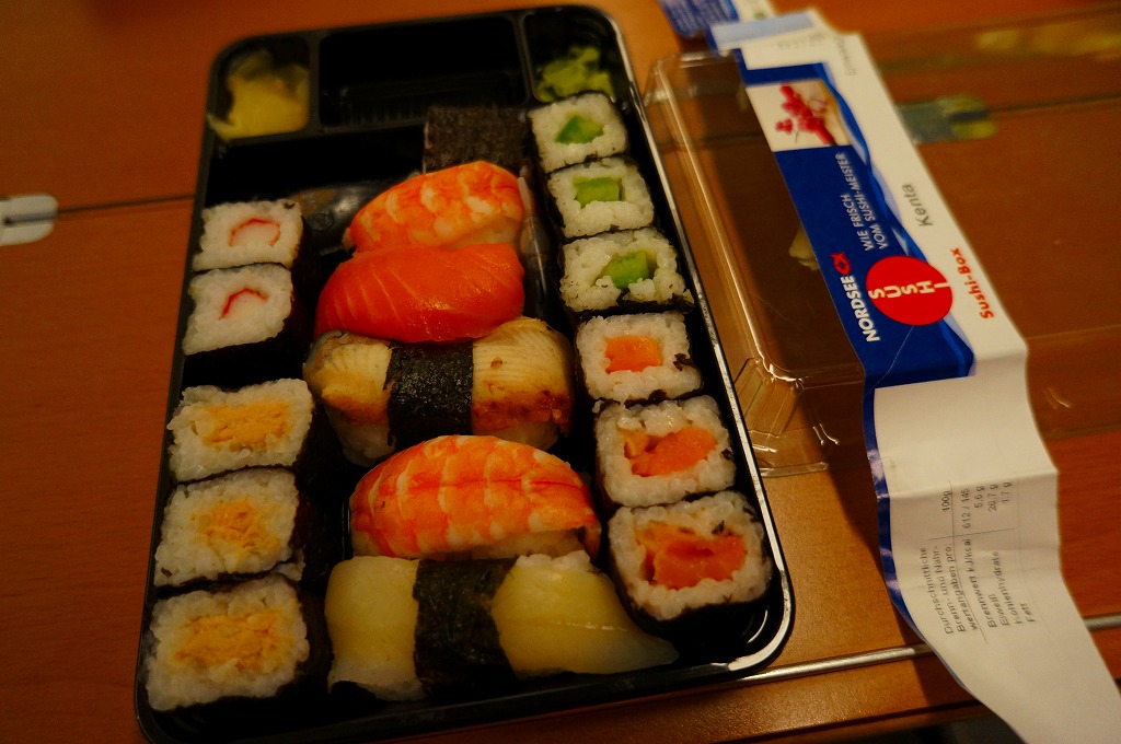 ドイツ国内でついに発見した欧州の駅弁。ではなく、ドイツで115年の歴史を刻む魚介類レストラン「NORDSEE」の惣菜屋で販売されている寿司。単独の冷蔵ケースに6、8、10ユーロと3種類あった商品のうち、最も高いものを選んでみた。惣菜向けプラ製容器を、ブランド名を印刷し食品表示を印字した紙製シールの帯で留める。「竹の香り」と袋に書かれた割りばしは日本向けのようで、「紙」のリサイクル識別表示まで付いていた。