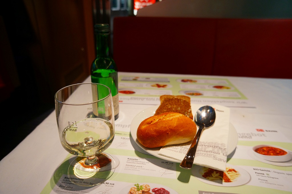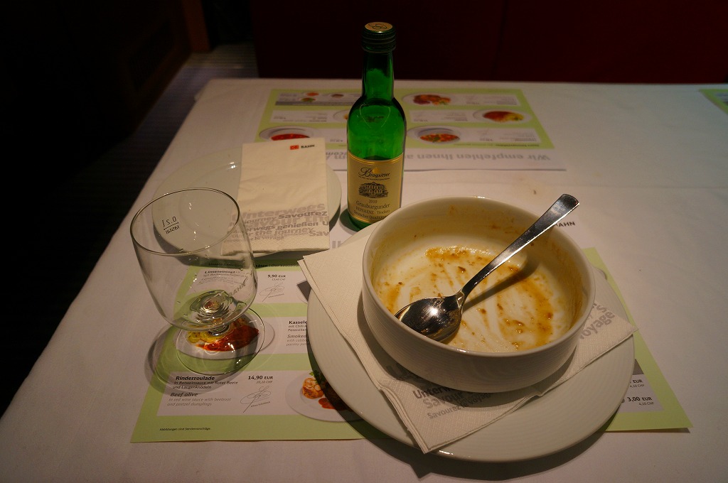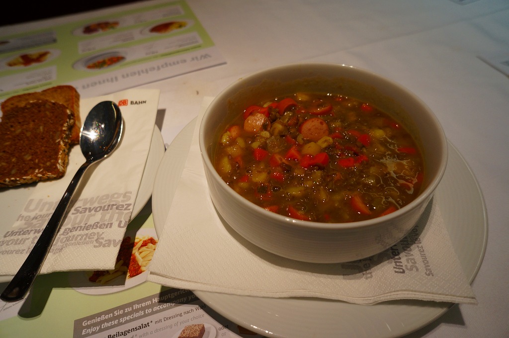 ドイツ版新幹線「ICE」の食堂車で注文した料理。ランチョンマットを兼ねた紙製メニューや、1等車座席に備わるオーダーメニューでも写真入りで掲載されていたため、このときのおすすめメニューなのだろう。料理名は「レンズ豆のスープ」だそうで、陶製の食器にポテトやソーセージやニンジンやタマネギなどを刻んだものと、ダイズより少し大きな豆が、ビーフ味の茶色いスープで煮込まれていた。パンが付いて、ミニボトルの白ワインも注文して16.2ユーロ。