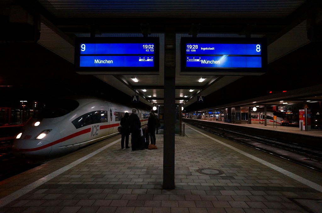 ドイツで最初の鉄道は1835年12月7日、バイエルン州のニュルンベルクとその近郊のフュルトとの間、4.6マイル(約7km)の区間で開業した。1844年には州立鉄道がこの中央駅を開設、19世紀のうちに各方面への幹線鉄道が整備されたという。第二次大戦の空爆で旧市街ごと壊滅したが、後に歴史的な面影が感じられる現在の姿に再建されている。駅舎内は十字の吹き抜けに2層の店舗が面する中規模なショッピングセンターになっており、クリスマス休暇で大きなリュックやトランクを持つ旅客で賑わっていた。